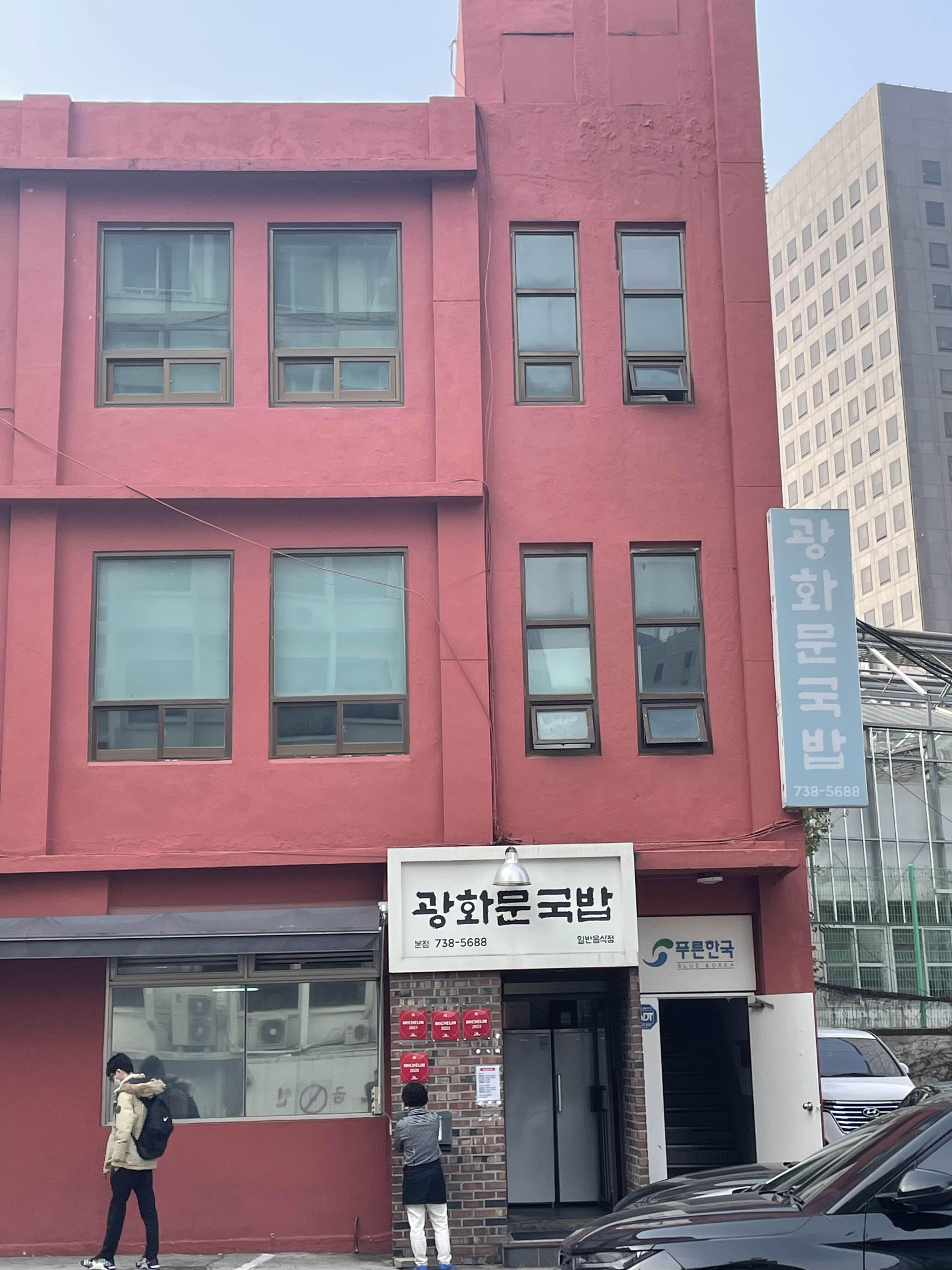 돼지국밥은 돼지국밥답게 정구지 푹푹 말아서 쓰까 먹어야하는 것일까요. 이런 부산식 돼지국밥에 도전장을 던진 돼지국밥이 있었으니 바로 광화문국밥 되시겠다. 가게 간판부터 굉장히 도전적이고 외관도 혁명적이다. 붉은 외벽은 마치 러시아의 10월을 떠올리게 한다. 한마디로 볼셰비키 정신을 가지고 볼셰비키가 만든 국밥이다. 참고로 글쓴이는 돼지국밥이라면 환장하는 국밥충이다.