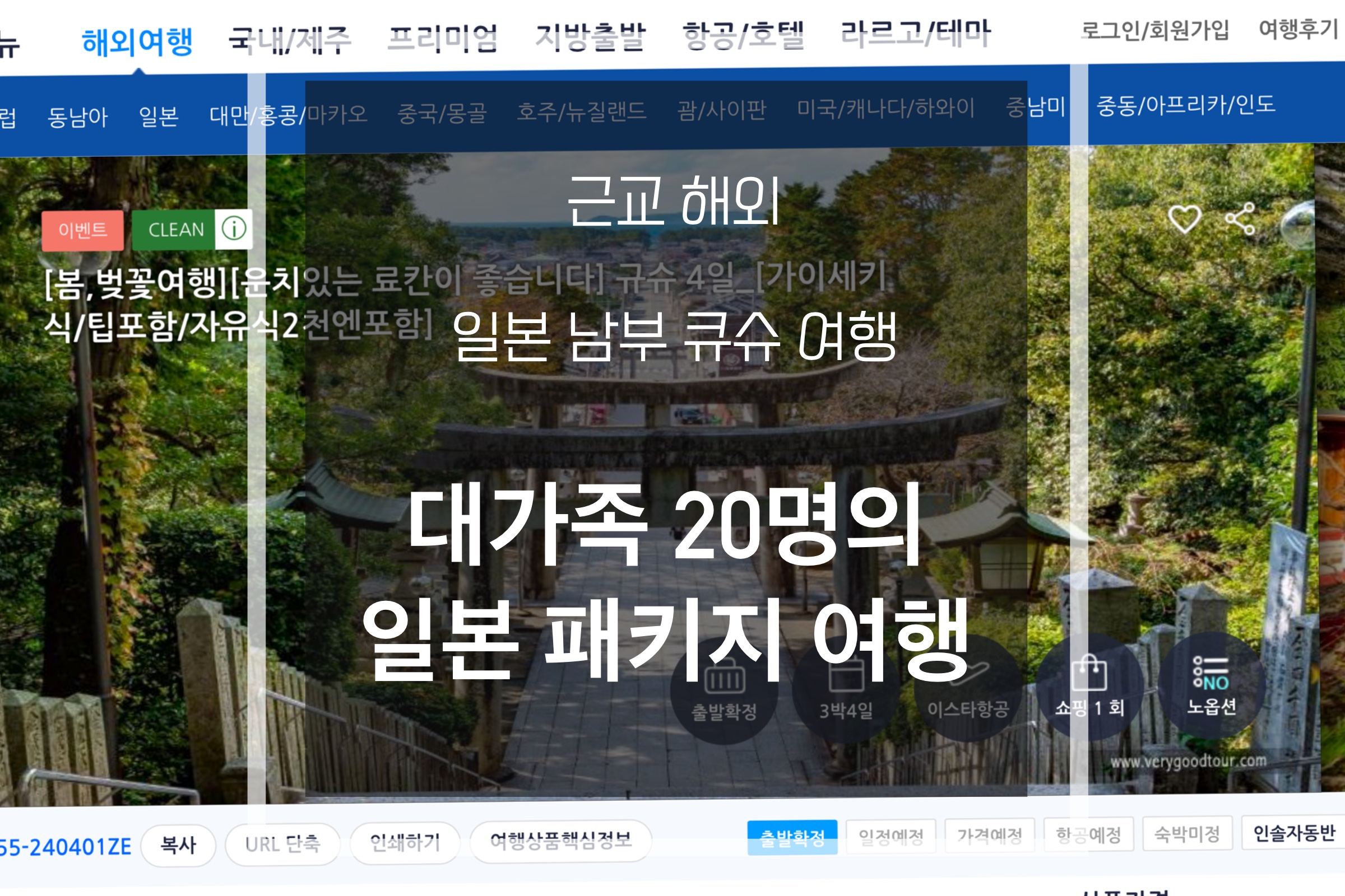 이제는 여행의 마지막 단계, 어떤 여행사를 통해서 갈 것인가만 정하면 됩니다. 우리나라에는 여러 여행사가 있죠. 다양하게 알아보다가 참 좋은 여행에서 진행하고 있는 큐슈 여행이 최적이라고 생각하고 약 두달 전에 예약을 했습니다. 이정도면 충분하게 할 줄 알았는데 이런 대규모 패키지를 예약하려면 적어도 세달 전에는 예약을 시작해야 할 것 같습니다. 대부분의 여행사에서 15명 이상은 별도로 구성을 해주기도 하니까요. 저는 미루고 미루다. 결국 여행이 임박해서 패키지를 신청하게 되었습니다.