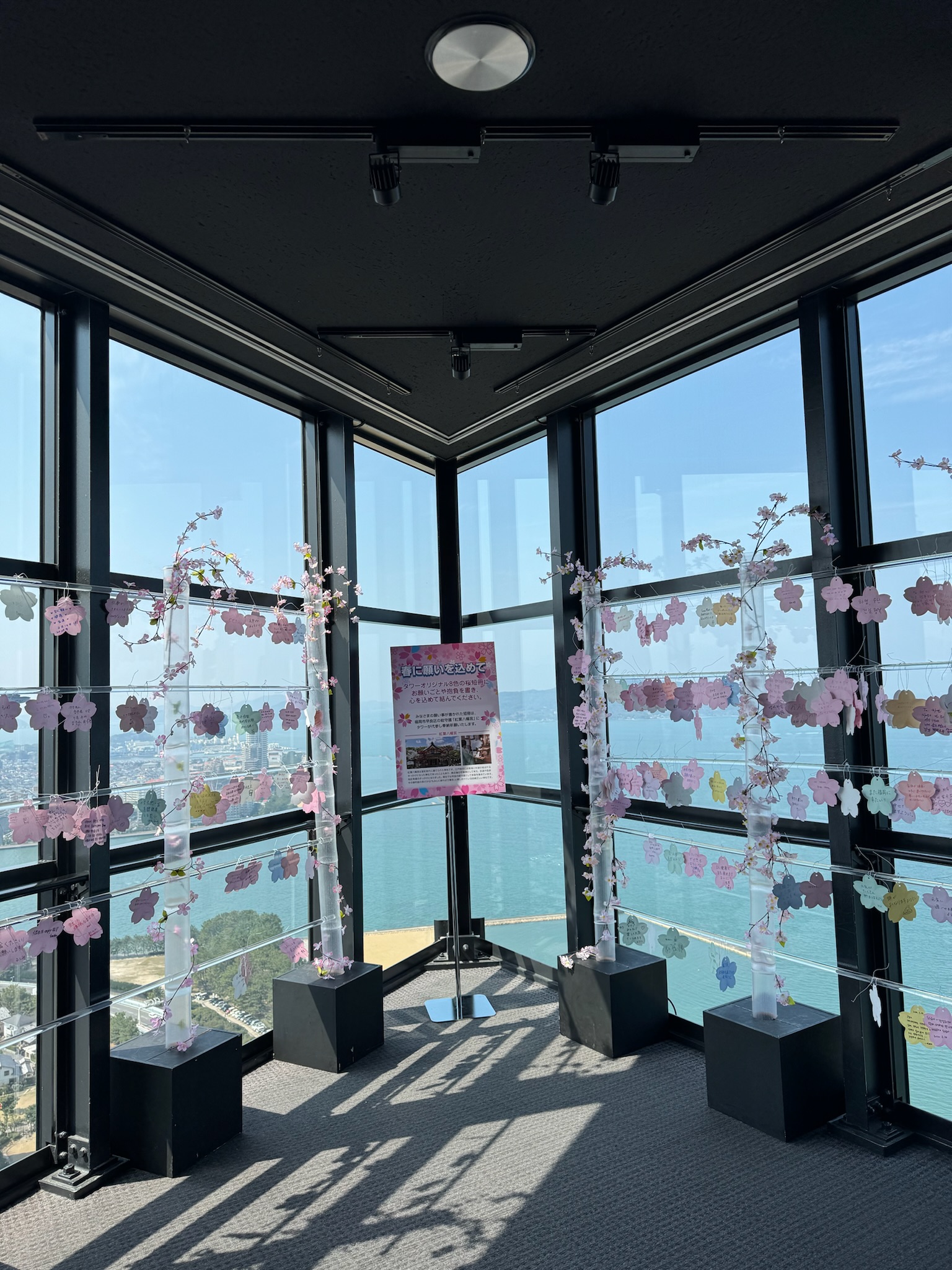후쿠오카타워는 방송국 안테나가 높게 달린 후쿠오카의 랜드마크입니다. 안테나를 포함한 총 높이는 234미터로 일본에서 가장 높은 해변타워입니다. 진도 7에도 견딜 수 있는 내진설계가 되어있고 8,000개의 유리가 사면을 감싸고 있습니다.