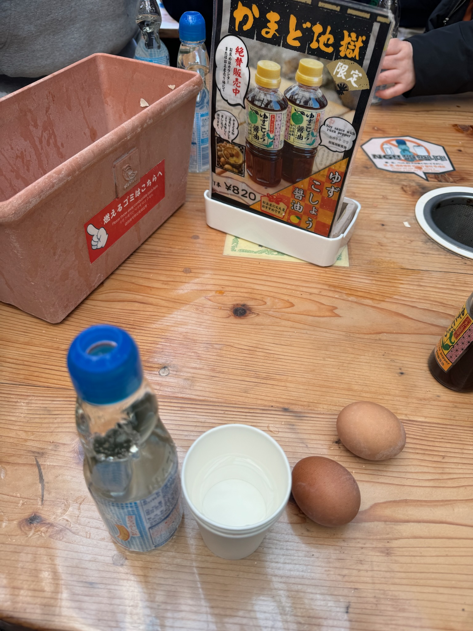 족욕하는 곳에 오면 일본의 천연사이다 라무네 한병과 맥반석 달걀 같은 유황온천으로 삶은 달걀 한 개를 줍니다. 특히, 달걀 노른자에 뿌려먹던 유자 간장이 특이하고 맛있었습니다. 결국 삶은 달걀 20개를 샀습니다. 소금과 유자간장을 조금 같이 포장해줍니다.