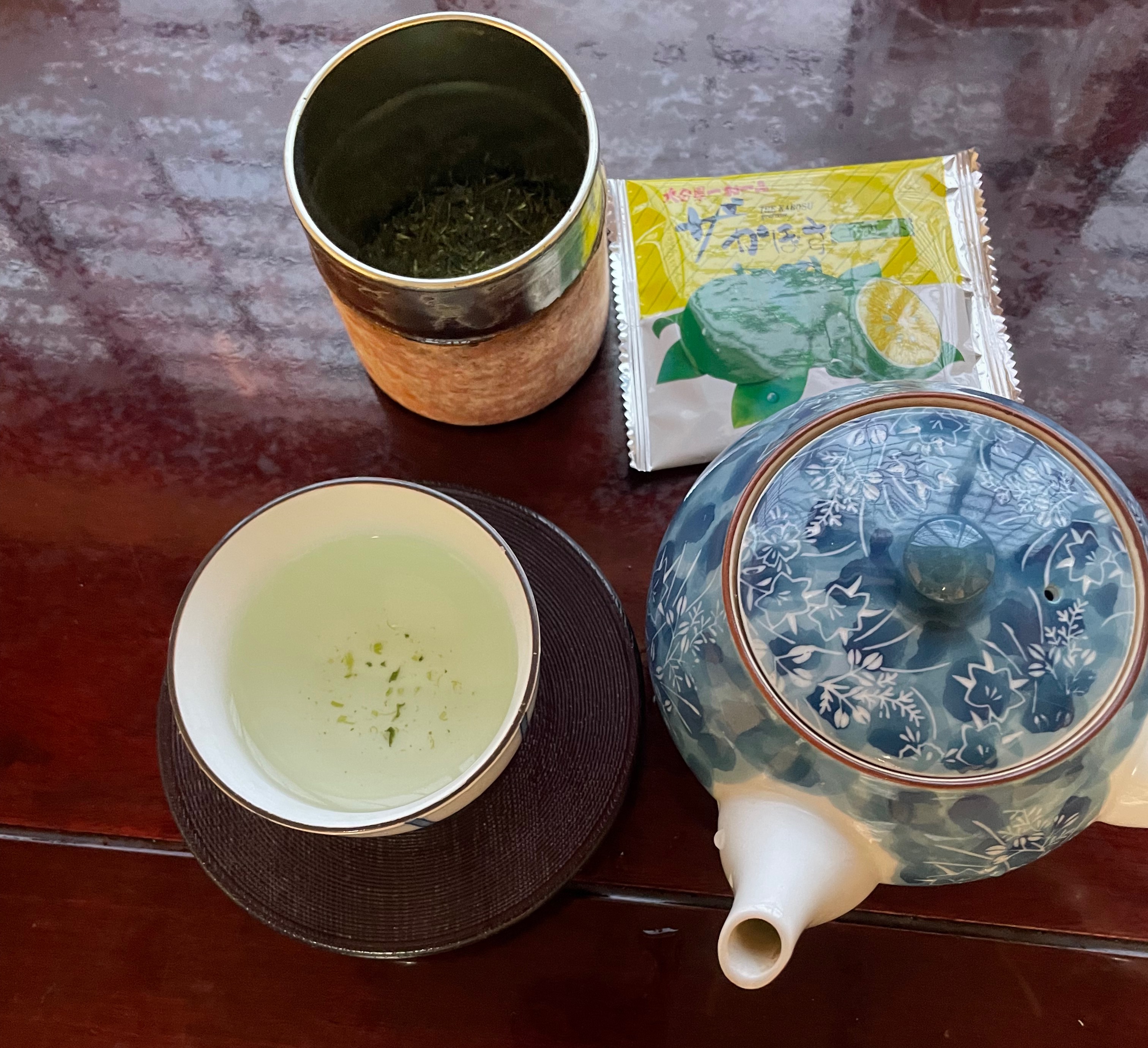 아이를 깨우지도 못하고 차마 혼자 두지도 못했기 때문에 아쉬운데로 고코노에 유유테이 호텔 객실에 있는 다과 세트로 아이가 일어날 때까지 혼자 녹차를 즐기고 있었습니다. 분말이 고운게 말차느낌이 났습니다. 보온통에 들어있던 따듯한 물은 다음날 아침까지도 차를 타 먹고 좋은 따듯한 온도로 남아있었습니다. 찻잎을 거르는 망이 없었기 때문에 고운 녹차의 분말이 차를 마실 때 조금씩 들어왔습니다.