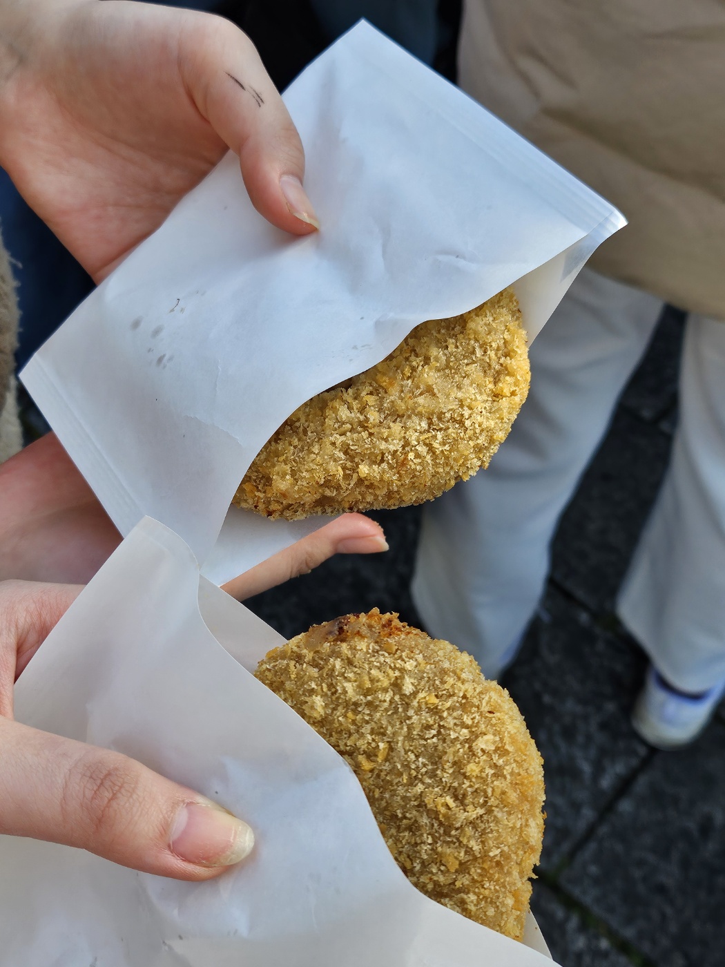 긴린호수를 간단히 돌아보고 나서 민예거리를 돌아보는데 금상고로케라는 곳에서 고로케를 하나씩 사서 돌려줍니다. 금상고로케는 NHK 방송국에서 하는 고로케 경연대회에서 금상을 탔다는 것으로 유명해 졌다는데 이 고로케집에서 금상을 탔다는 그 대회가 그 이후로는 열리지 않았다고 합니다. 될사람은 이렇게 잘 됩니다. 마치 미스터트롯 1차에서 우승한 임영웅이 지금도 우리에게 잊혀지지 않는 영웅으로 등극한 것처럼요.