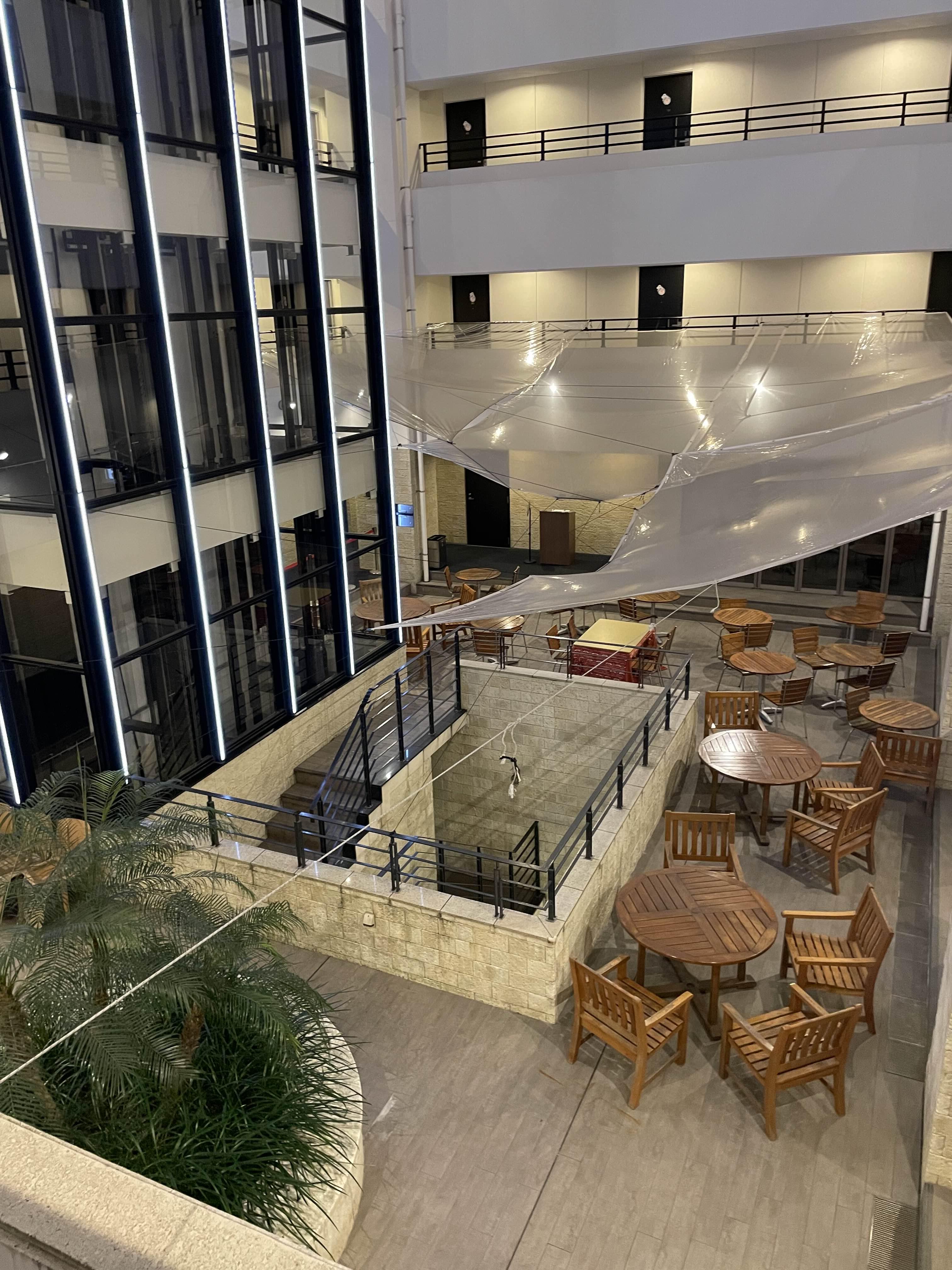 다시 호텔이야기로 돌아가 보자면 호텔은 가운데가 뻥 뚤린 ㅁ 구조입니다. 그리고 아래 사진처럼 객실 가운데가 복도형으로 되어있구요. 천장은 뚫려있습니다. 그렇기 때문에 밑에 보이는 비닐 천막은 비를 막기 위해 쳐놓은 것이죠. 조식을 먹을 공간이 조금 협소하기 때문에 저 밖의 공간에서 조식을 먹기도 합니다.