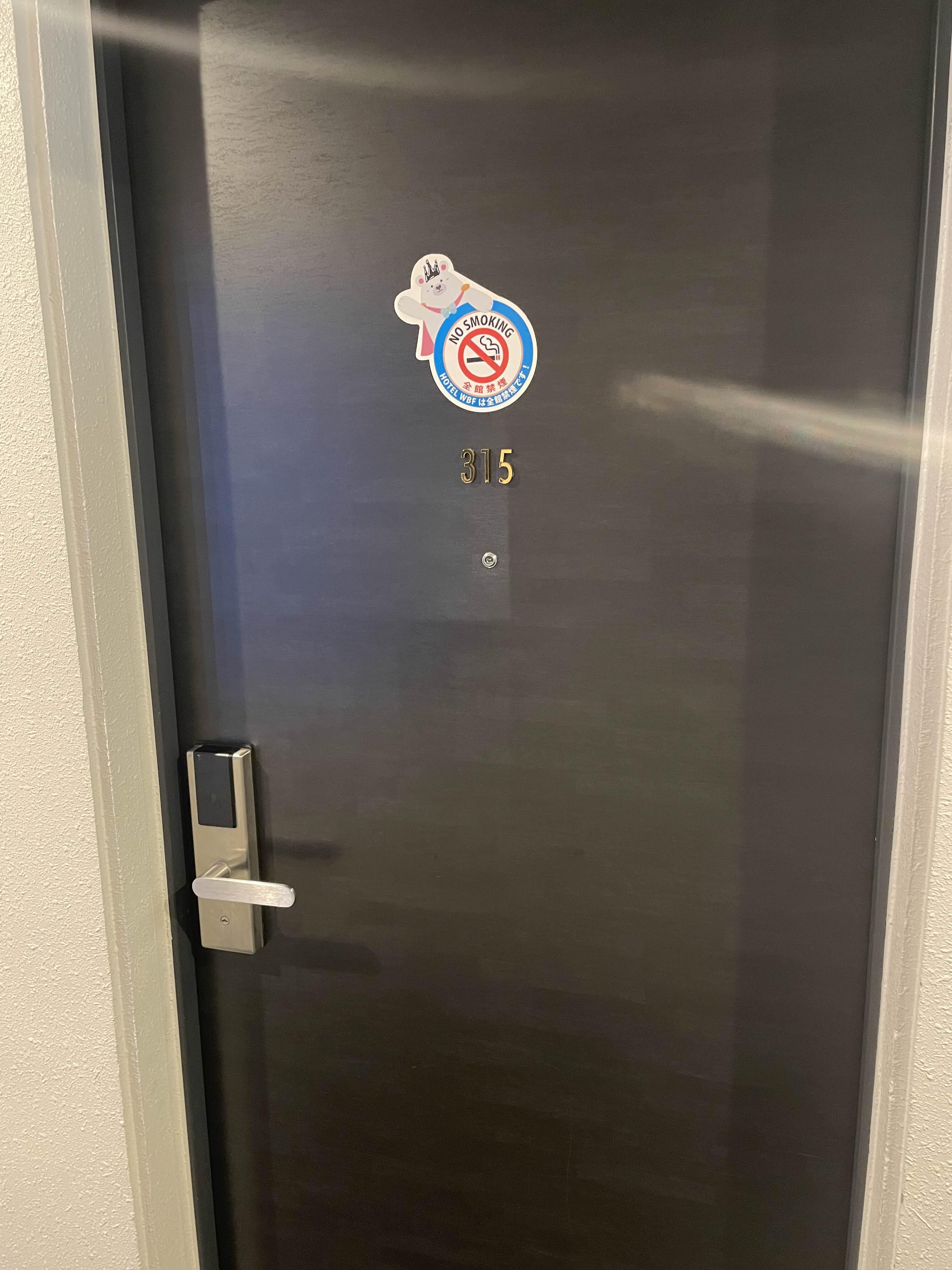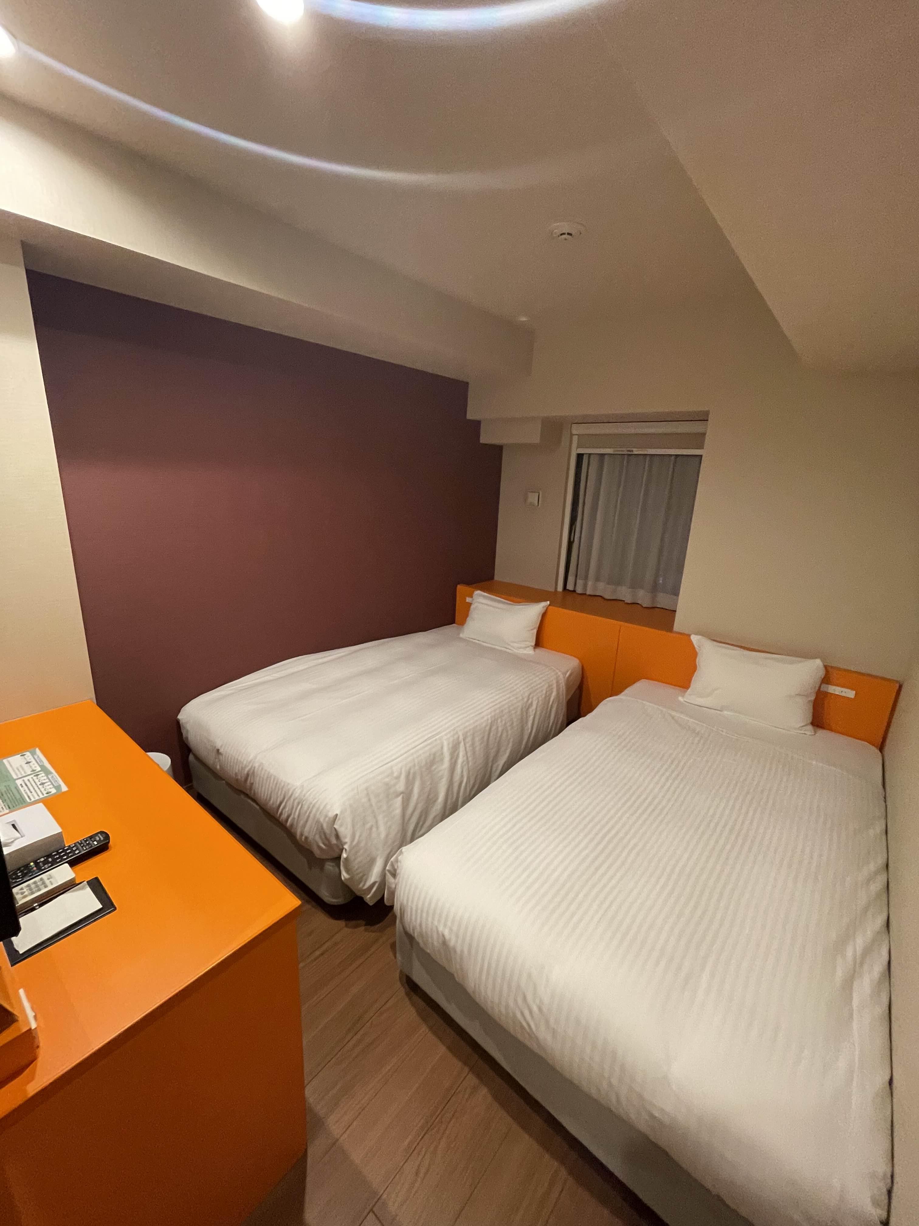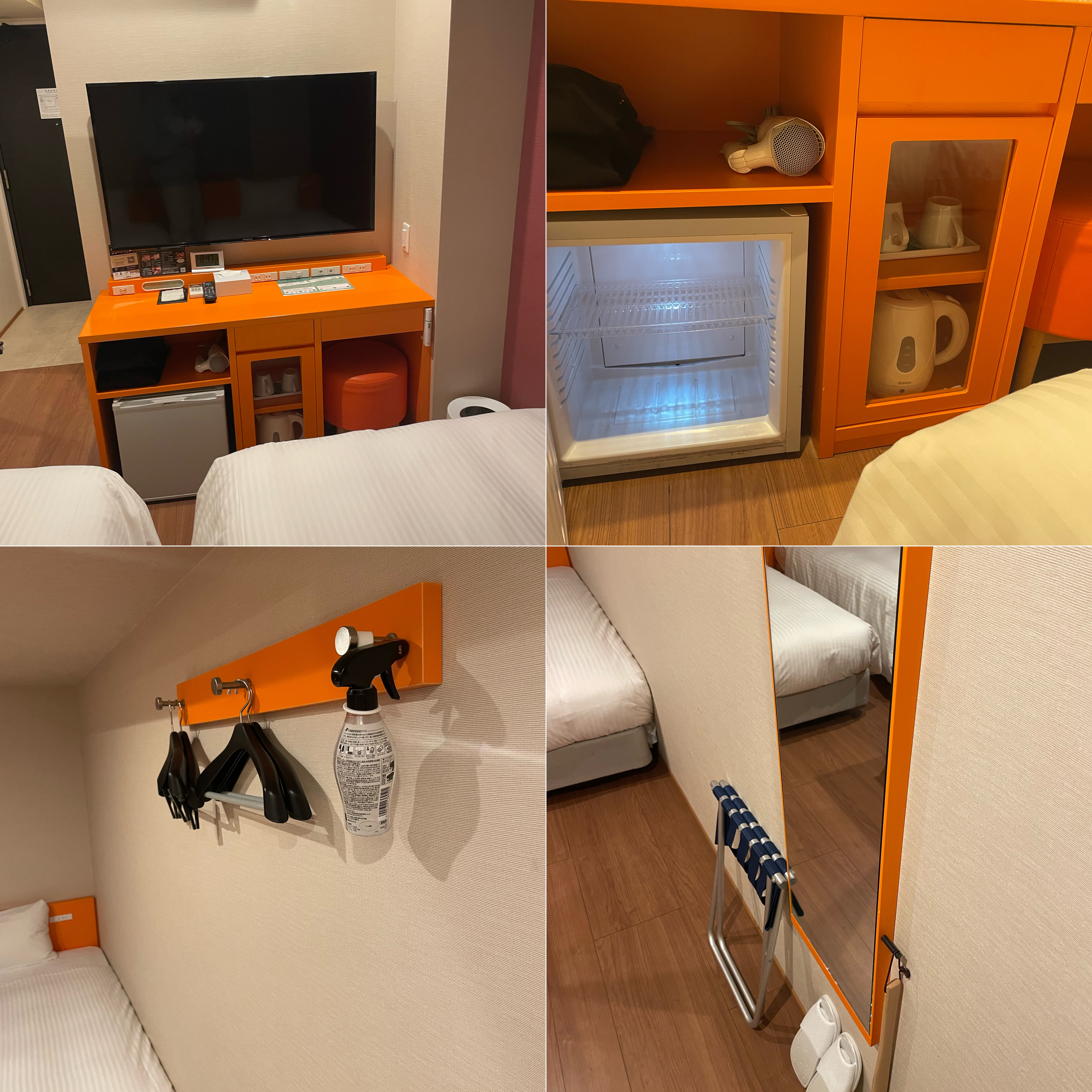 내부는 주황색으로 인테리어되어있습니다. 왜 이런색인지는 잘 모르겠지만 굉장히 강렬한 색입니다. 티비랑 옷장, 거울 등이 있고 어메니티는 1회용이 아닙니다. 굉장히 깔끔하며 냉장고에는 홈바도 물도 없기 때문에 맞은 편에 있는 편의점에서 사와서 드셔야합니다. 차를 먹을 수 있는 간단한 도구들이 있고 침대는 트윈룸입니다. 객실은 굉장히 좁습니다. 캐리어가방을 올려 놓을 수 있는 수납공간을 펴면 걸어서 돌아다니기도 힘들 정도입니다.