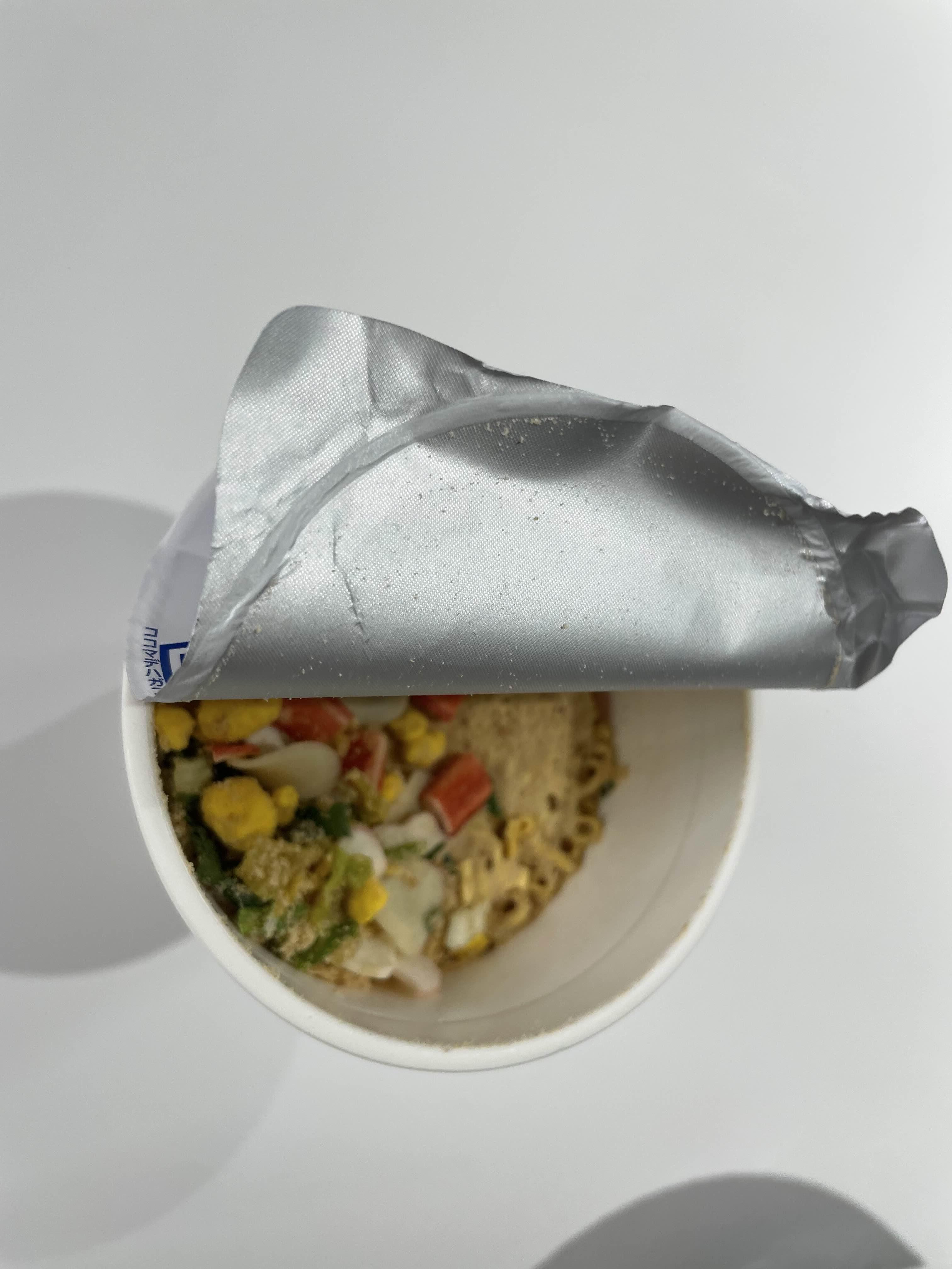 3분뒤에 드디어 뚜껑을 열었습니다. 스프가 드문드문 녹지 않았는데 섞어주면 되니 크게 상관없스빈다. 갈색 건더기가 눈의 띄고 면발은 하얀색입니다. 국물은 크림처럼 굉장히 부드럽고 면발도 쫄깃한 식감이 제대로 납니다. 컵라면이 다르면 얼마나 다르겠어라고 생각하실 수 있겠지만, 우리나라에서는 먹어볼 수 없는 맛과 식감입니다.