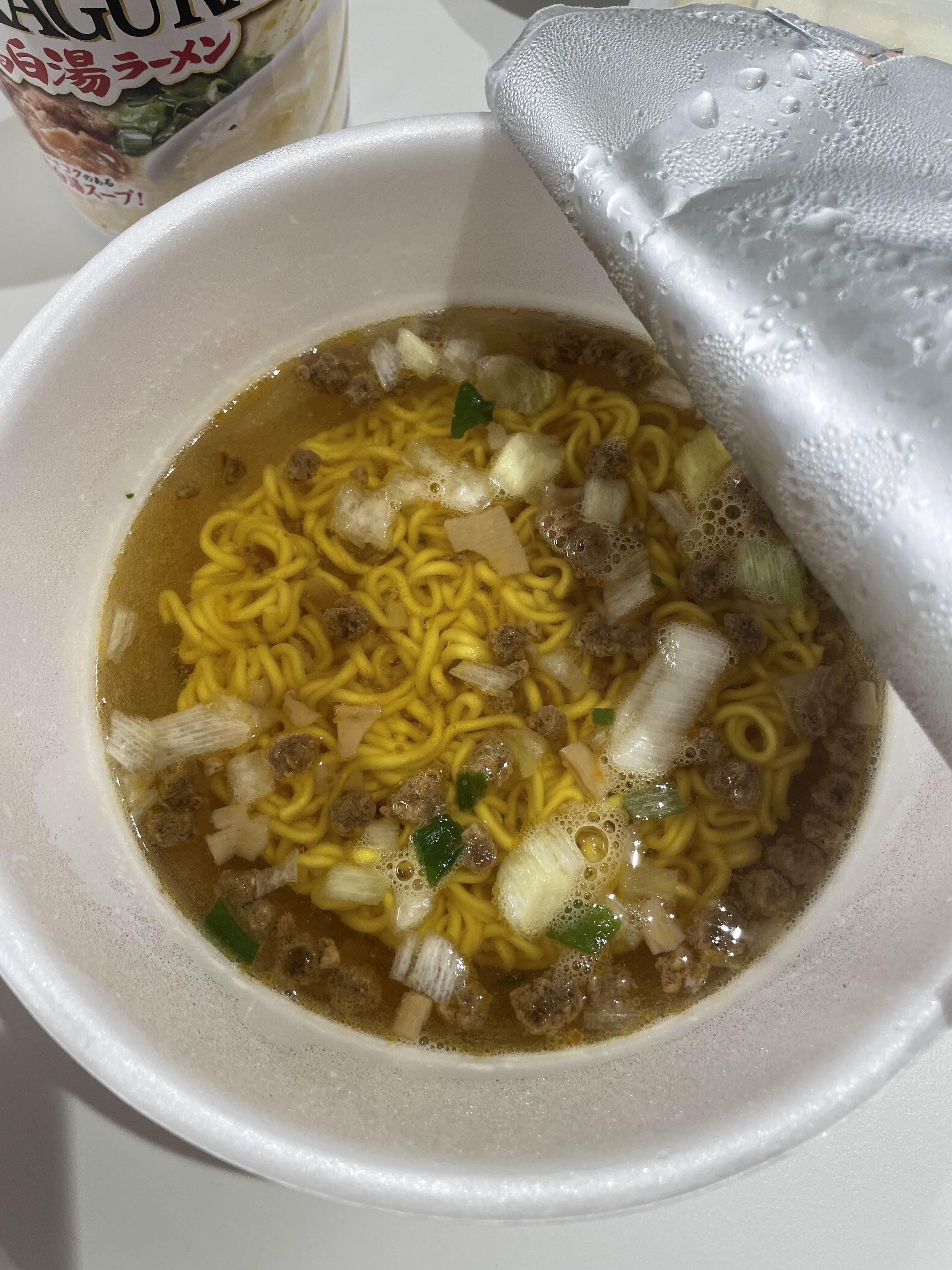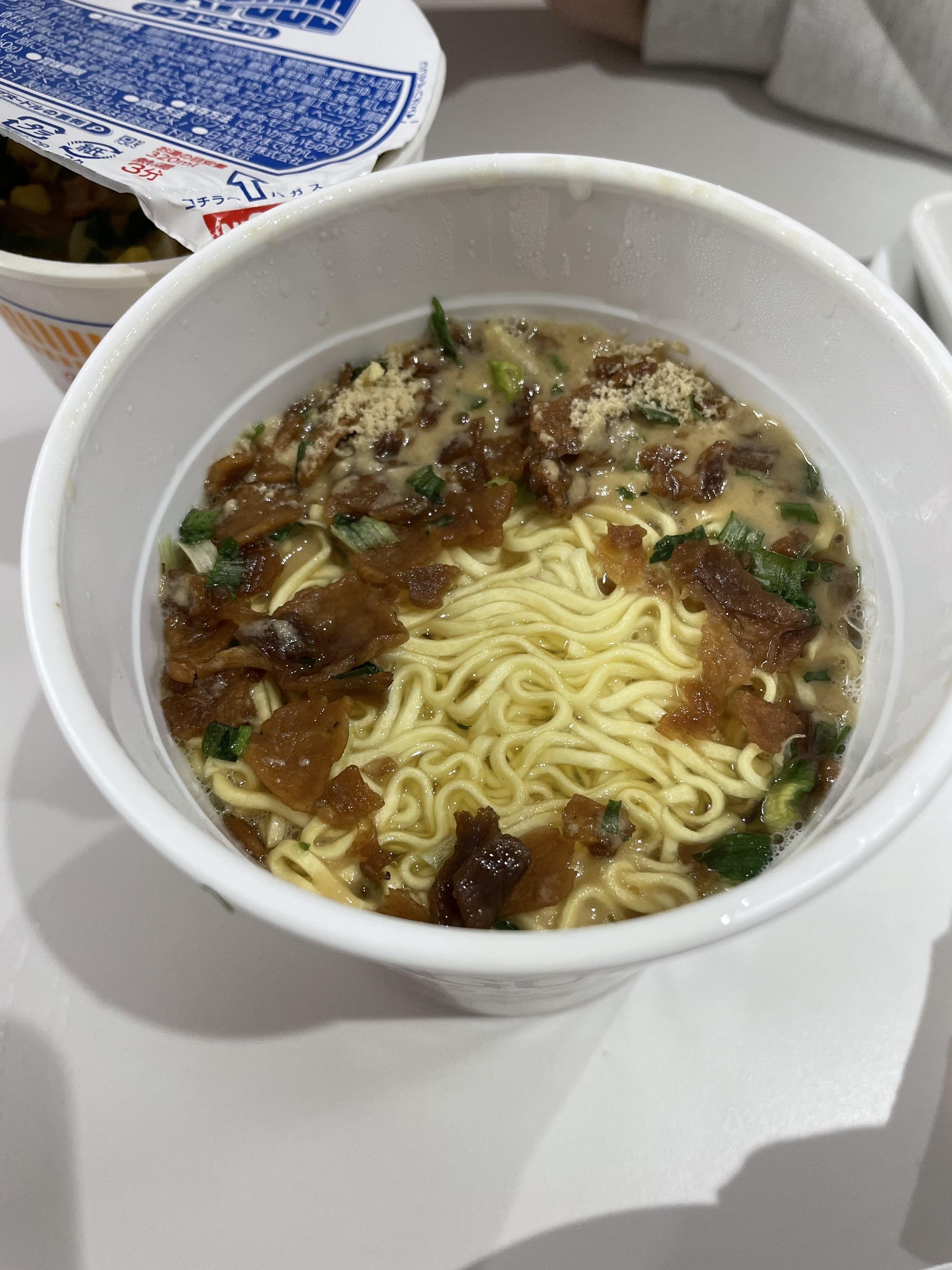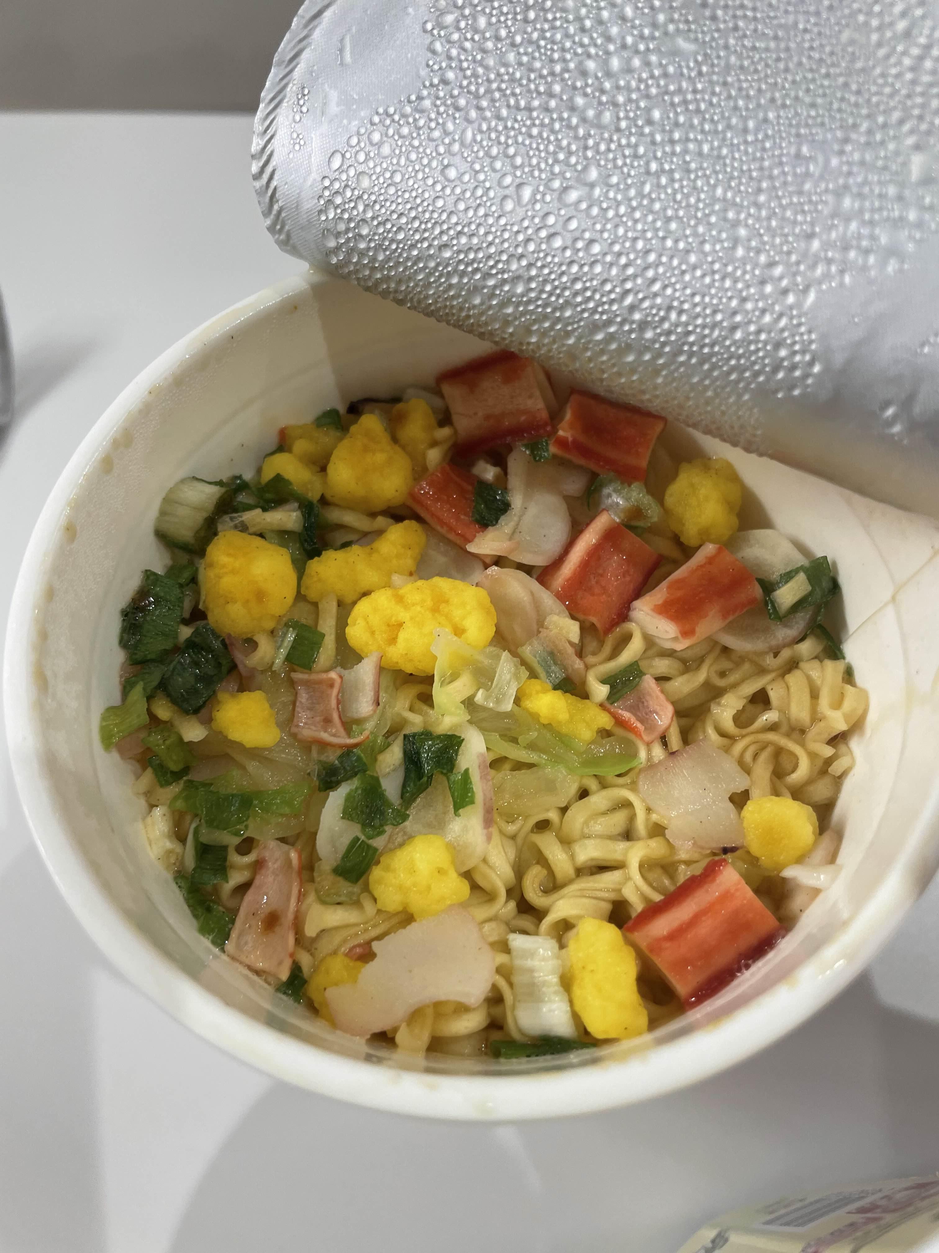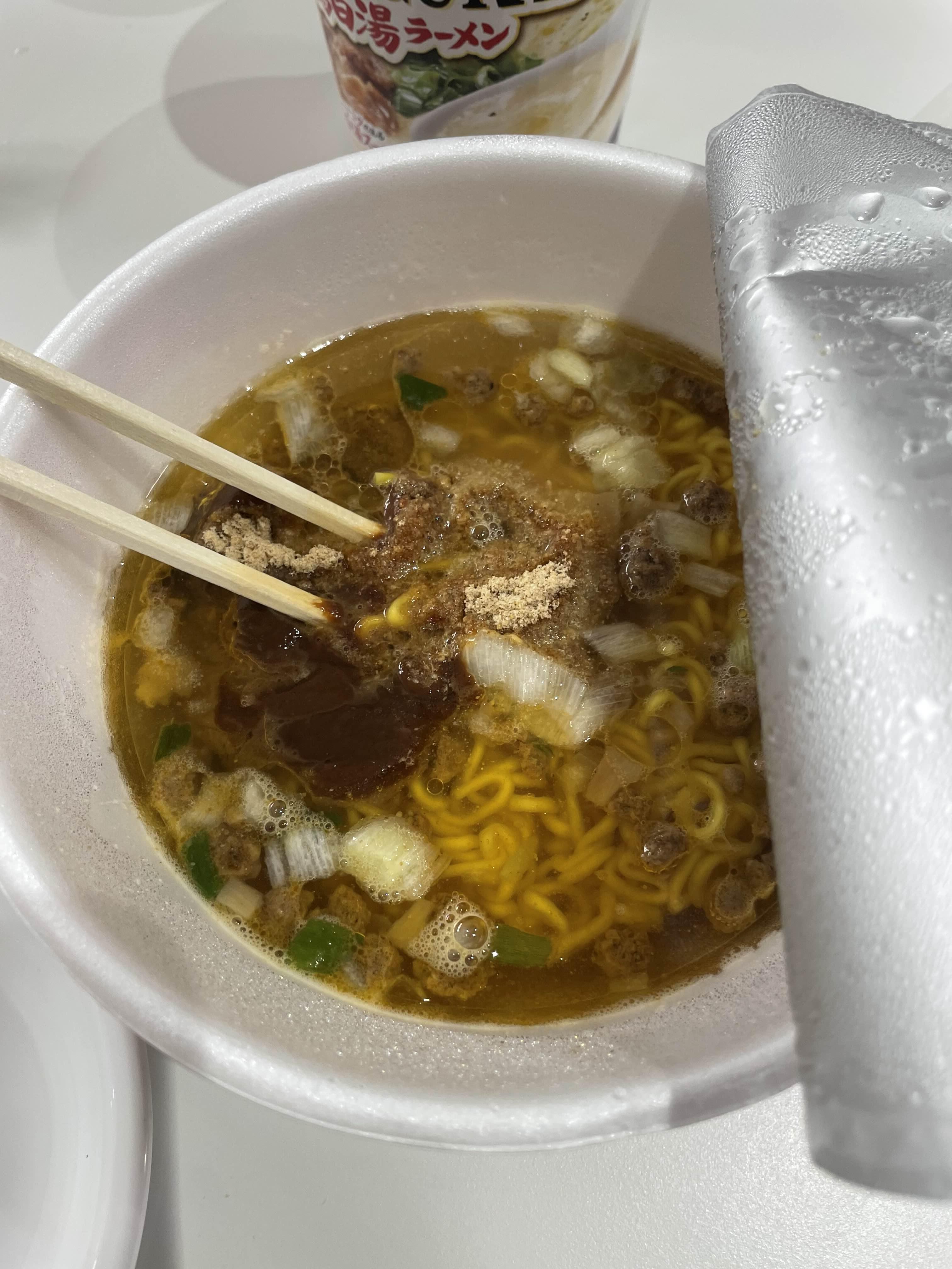 3분뒤에 드디어 뚜껑을 열었습니다. 스프가 드문드문 녹지 않았는데 섞어주면 되니 크게 상관없스빈다. 갈색 건더기가 눈의 띄고 면발은 하얀색입니다. 국물은 크림처럼 굉장히 부드럽고 면발도 쫄깃한 식감이 제대로 납니다. 컵라면이 다르면 얼마나 다르겠어라고 생각하실 수 있겠지만, 우리나라에서는 먹어볼 수 없는 맛과 식감입니다.