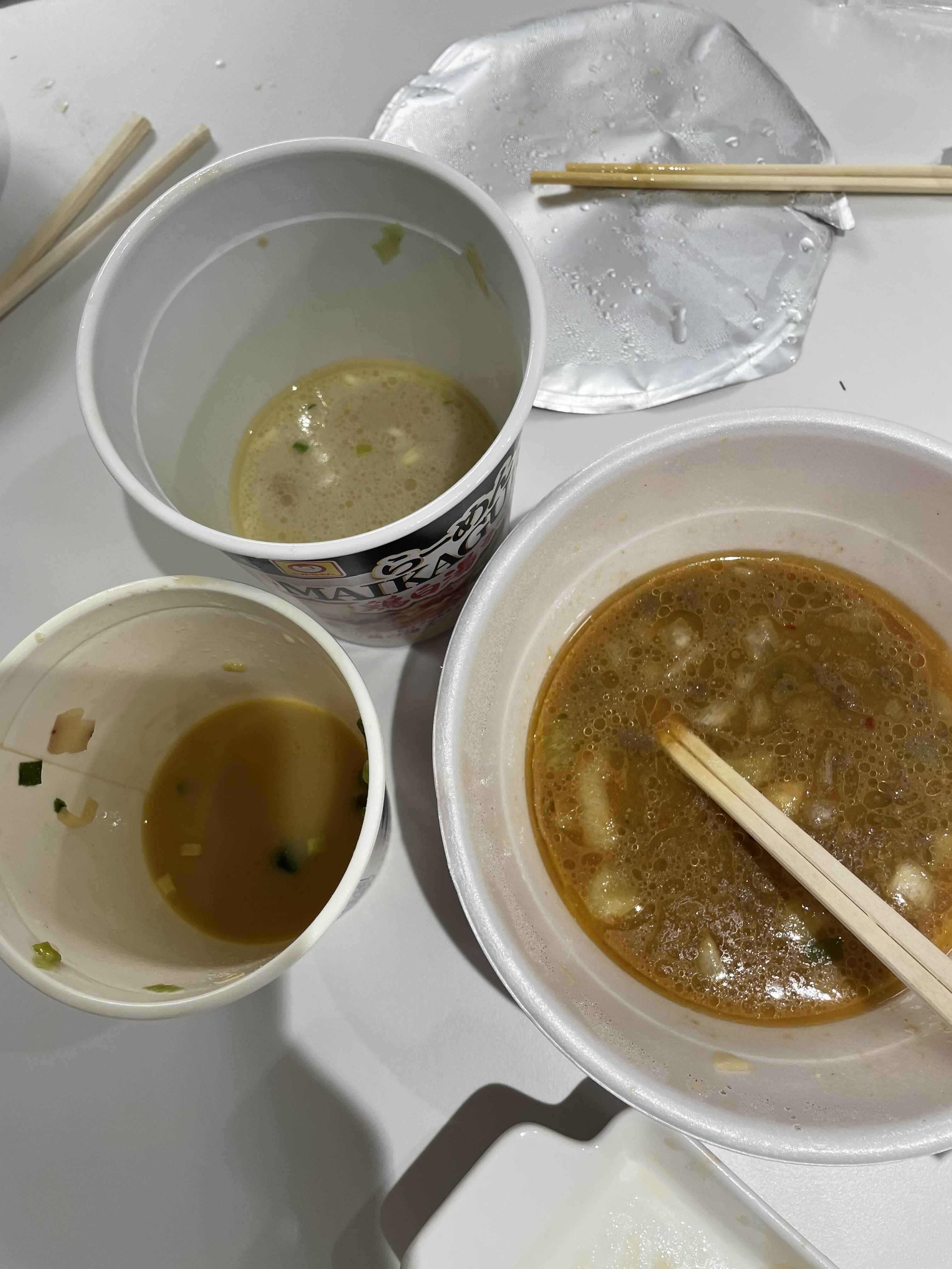 세가지 라면 모두 훌륭한 맛이었습니다. 그러니 제가 아래처럼 싹싹 비워 먹었겠죠. 일본에 가신가면 여러가지 라멘을 맛보실 수 있습니다. 라멘집을 직접 찾아가 먹는게 최고겠지만 그렇지 못한 경우나 저녁에 야식으로 먹기에 손색이 없을 정도의 맛입니다.