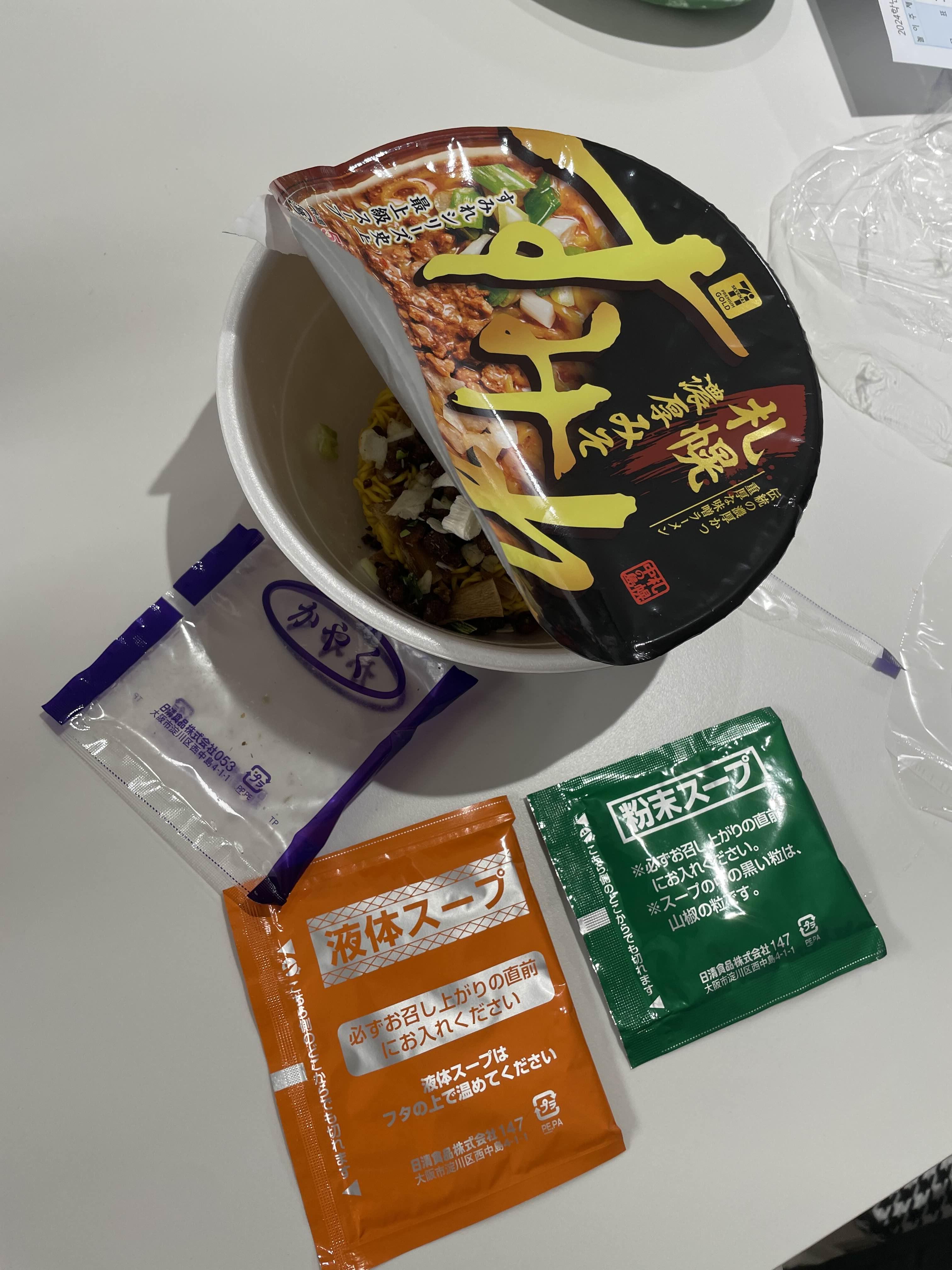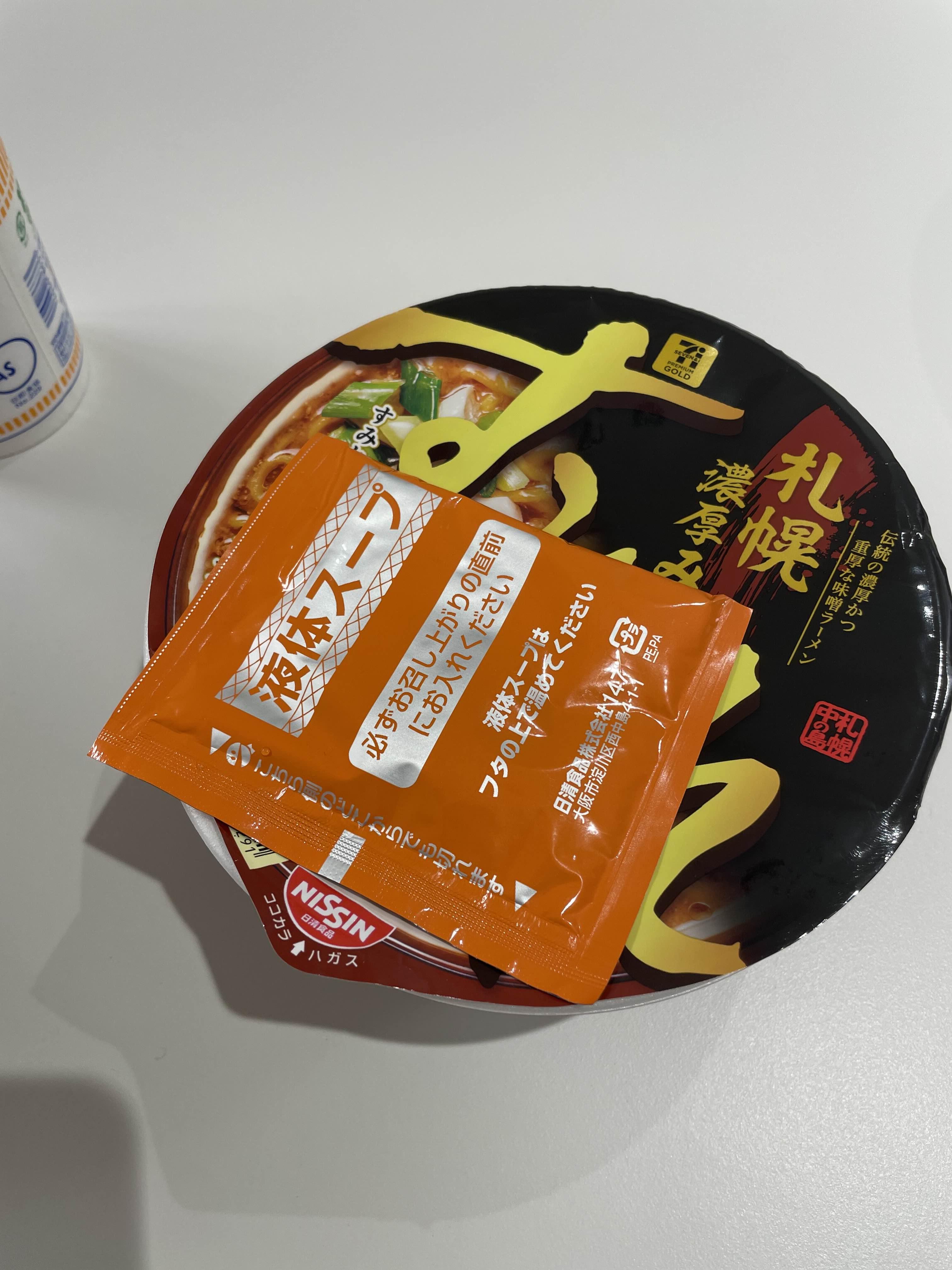 닛신에서 만들었으나 일본의 세븐일레븐에서 파는 PB상품으로 보입니다. 닛신 스미레 된장라면입니다. 표지는 검은색이고 삿포로 스타일의 라면이라고 합니다. 유명한 삿포로 된장라면 집엔 스미레 라면을 컵라면으로 만든 것인데 우리나라 식으로 하면 빨개면 같은 것입니다. 오프라인부터 유명해져서 PB 상품으로 재탄생한 것이지요. 스프는 세가지로 나뉘어있고 아래 투명한 스프는 건더기 스프였는데 이미 안에 건더기 스프를 넣고 사진을 찍어버렸습니다. 나머지는 후첨스프입니다.