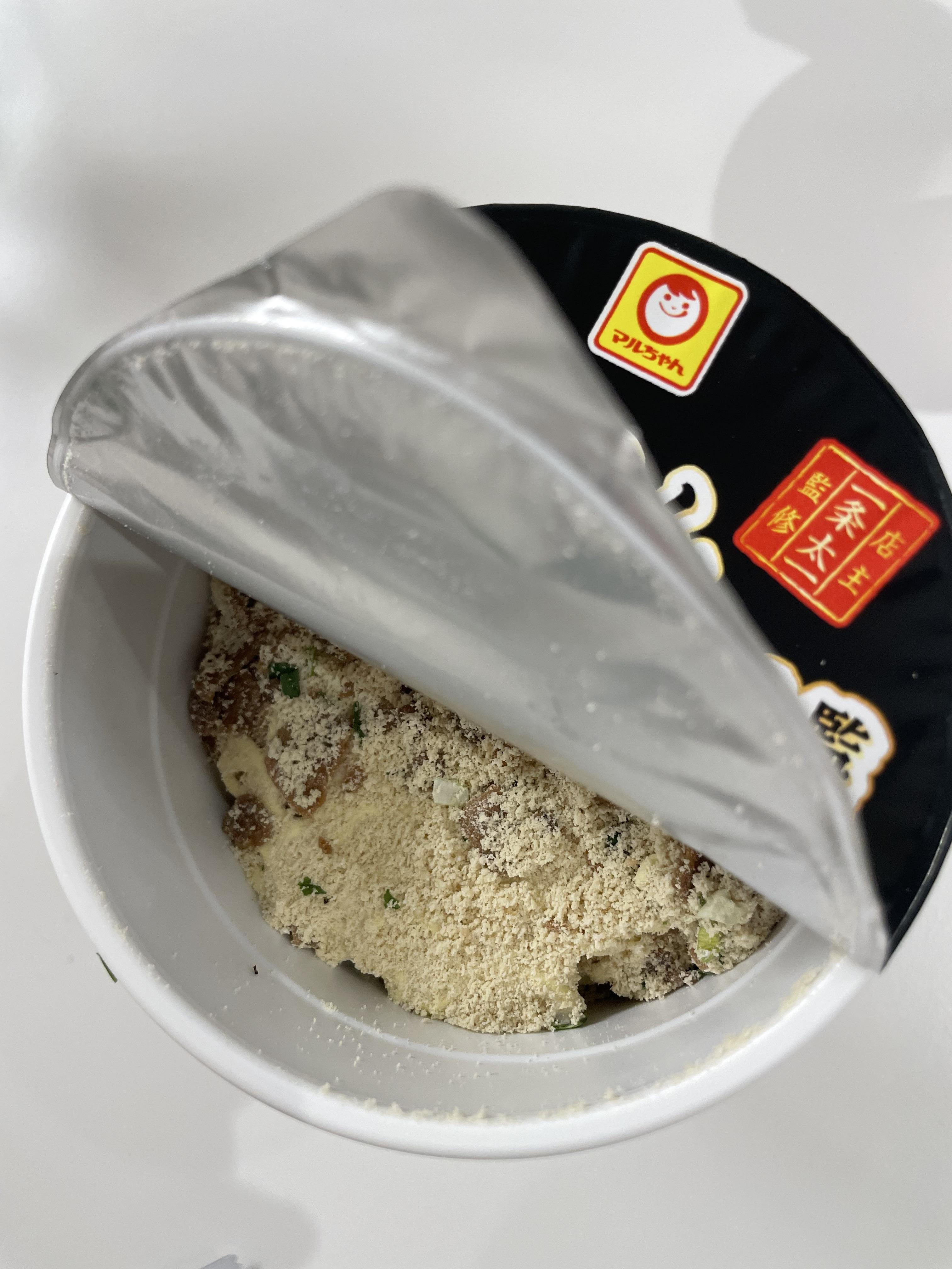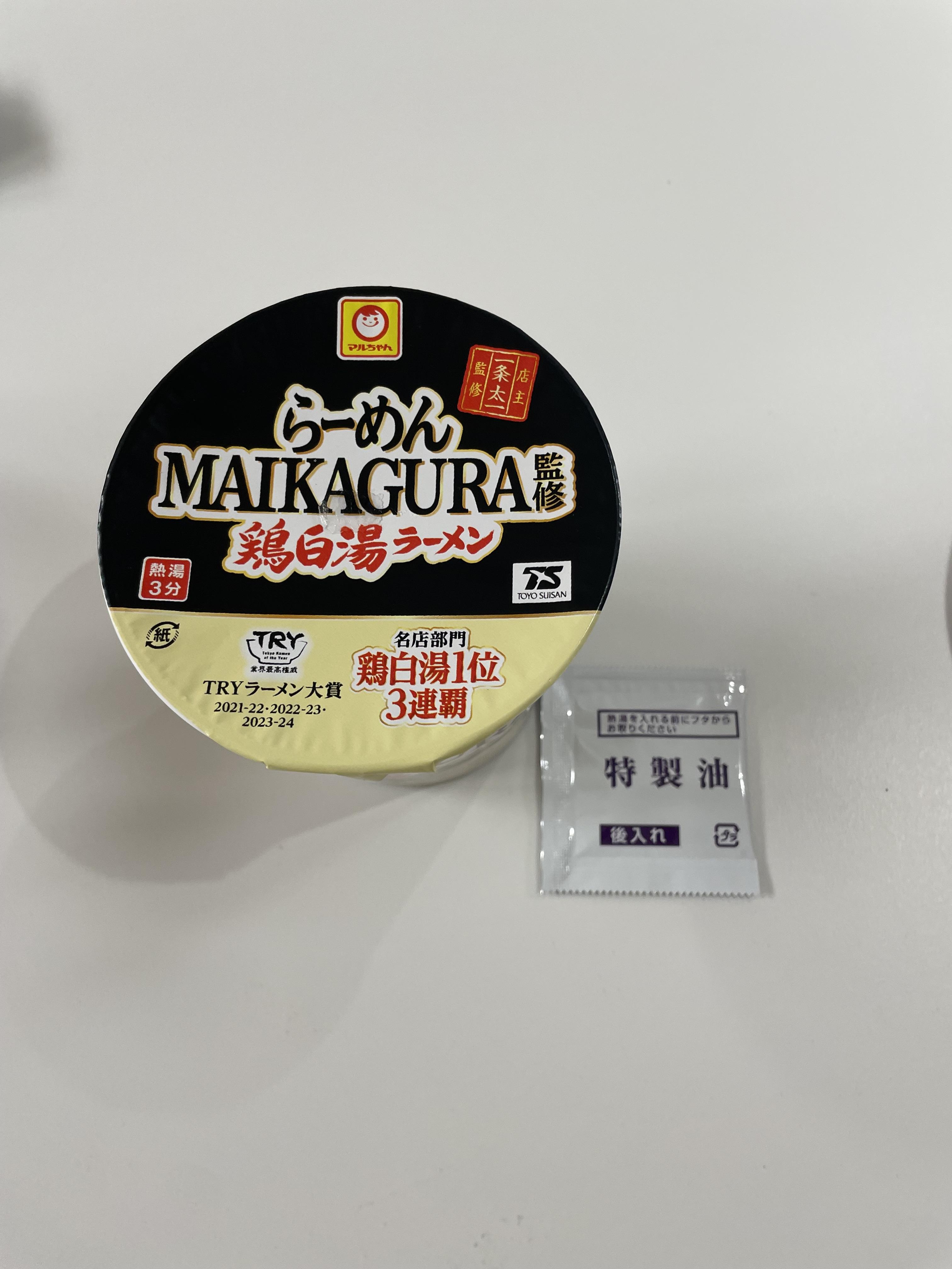 우선 셋 중에 가장 먼저 먹어볼 라면은 닭육수로 만든 마이카구라라면입니다. 영어 MAIKAGURA라고 써있기 때문에 찾기 쉬우실 것입니다. 마이카구라도 오프라인에서 유명한 라멘집입니다. 근데 직접 가서 드시려면 줄이 굉장히 길겠죠. 그래서 아쉬운대로 이렇게 컵라면으로 접하셔도 좋습니다. 이 라면은 일본의 대부분의 편의점에서 구하실 수 있습니다. 옆에 있는 하얀 작은 봉지는 후첨소스인데 나중에 넣으라고 써있습니다.