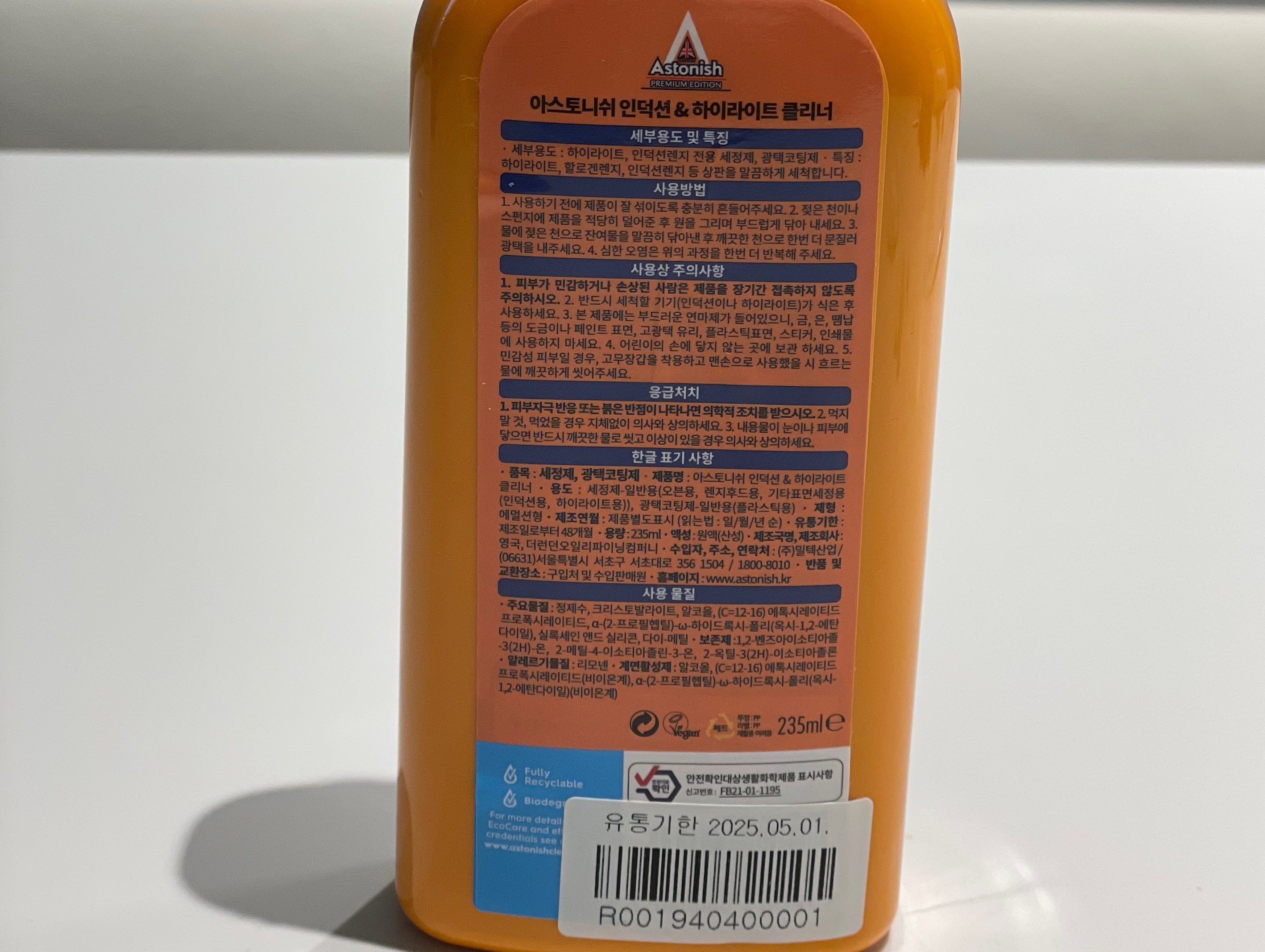 뒷면에는 사용법과 주의 사항이 써있습니다. 요약하자면 렌지전용 세정제 광택코팅제이며, 사용전에 잘 흔들어주세요. 사용법은 적당략을 덜은 뒤에 젖은 천이나 스펀지로 원을 그리며 닦아내고 난 뒤 깨끗한 천으로 잔여물을 말끔히 제거하라고 되어있습니다.