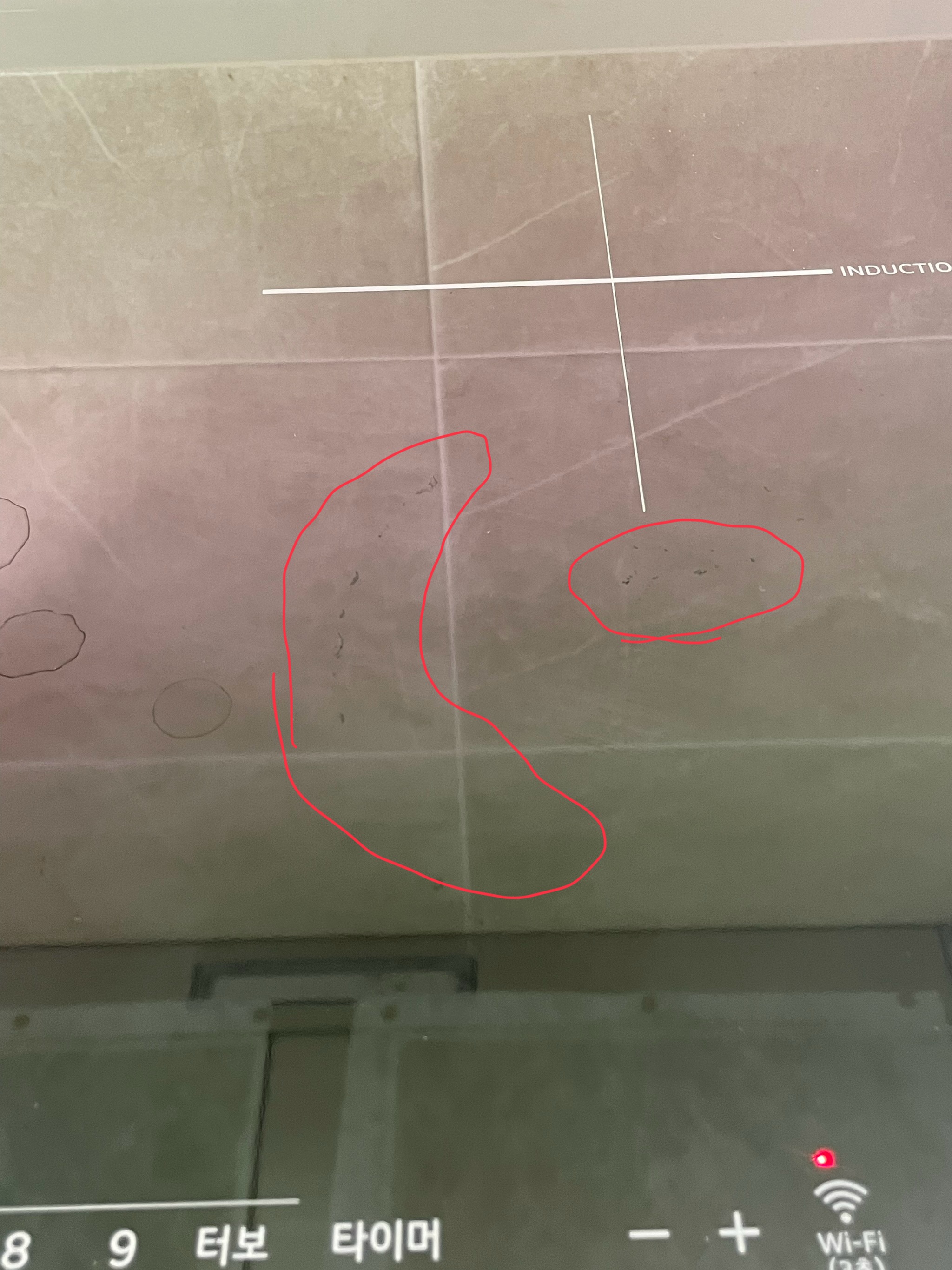 그보다 더 화딱지 나는 것은 흠집이었는데요. 이건 뭐때문에 생긴 건지 조금 집작이 가긴했습니다. 얼마 전에 스테이크를 한다고 까불면서 무쇠 프라이팬을 사용했는데 무쇠 프라이팬을 잠깐 올려 놓았을 때 묻은 흠집이었던 거 같습니다. 이건 좀 제 부주의가 있긴 했지만 잠깐 올려 놓았다고 생긴 흠집이 아무리 닦아도 지워지지 않습니다. 이거 막으려고 쇼트세란의 미라듀어 상판을 산건데 이렇게 허무하게 기스가 가는가 싶었습니다.