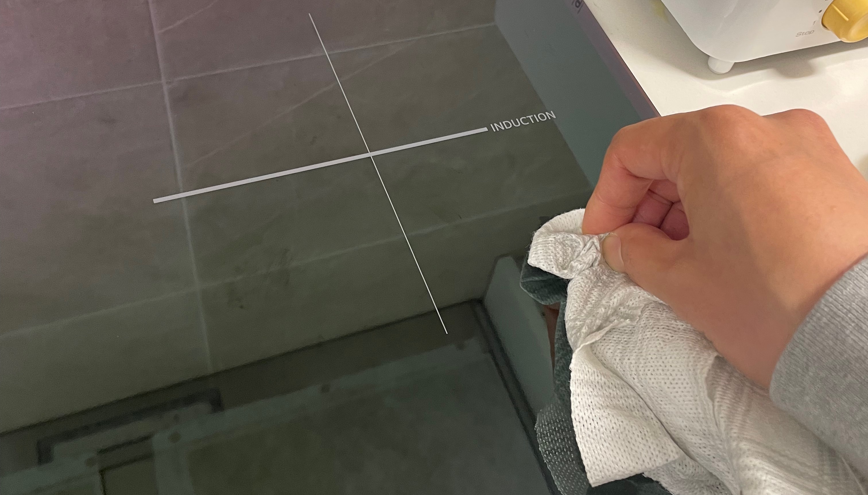 사용법은 간단합니다. 인덕션 상판이 식은 후에 적당량을 덜어서 젖은 천이나 스펀지에 묻힌 뒤 살살 원을 그리면서 닦아주는 것입니다. 부드럽다고는 하지만 연마제가 들어있다고 하니 코팅면이 너무 두르러지는 곳에는 사용하면 안됩니다. 마치 자동차 흠집이 났을때 바르는 컴파운드랑 유사한 느낌이라고 보시면 됩니다. 오염부위에만 제한적으로 사용해주는게 최대한 흠집을 덜 가게 할 수 있겠죠. 저는 행주로 했습니다. 아래처럼 오염된 부위를 살살 문질러줍니다. 힘줘서 빡빡 문지를 필요도 없습니다. 살살 문지르다 보면 얼룩과 흠집이 지워지는게 보입니다.