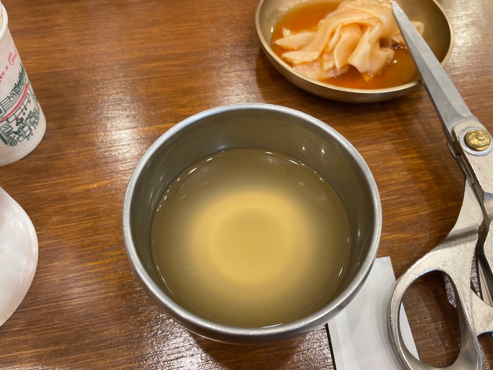 면수대신 따듯한 육수가 나옵니다. 냉면집에 육수가 나오는 것도 좋고 면수가 나오는 것도 좋죠. 예전에는 갈비 전문점에서 냉면을 제대로 뽑기도 했었는데 고기 육수를 사용하는 곳에서 냉면을 만드는 게 어떻게 보면 당연할 수도 있습니다. 진주냉면도 다른 냉면집과 다르지 않게 육수가 나옵니다. 맛은 냉면집에서 흔히 나오는 육수의 맛이 납니다.