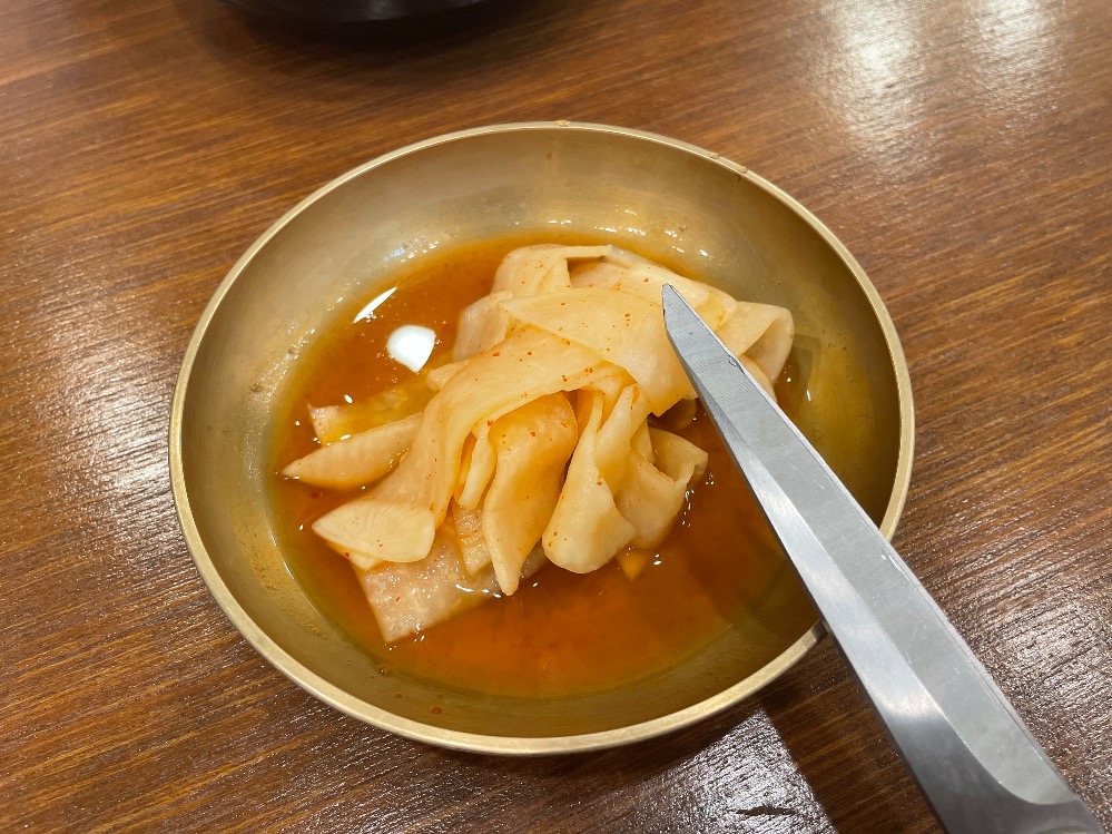 그런 면에서 무절임이 나오는 것도 이상하지 않습니다. 다만 고춧가루가 들어가서 약간 매콤한 맛을 더했습니다. 맵지는 않습니다. 아이도 먹을 수 있을 정도입니다.