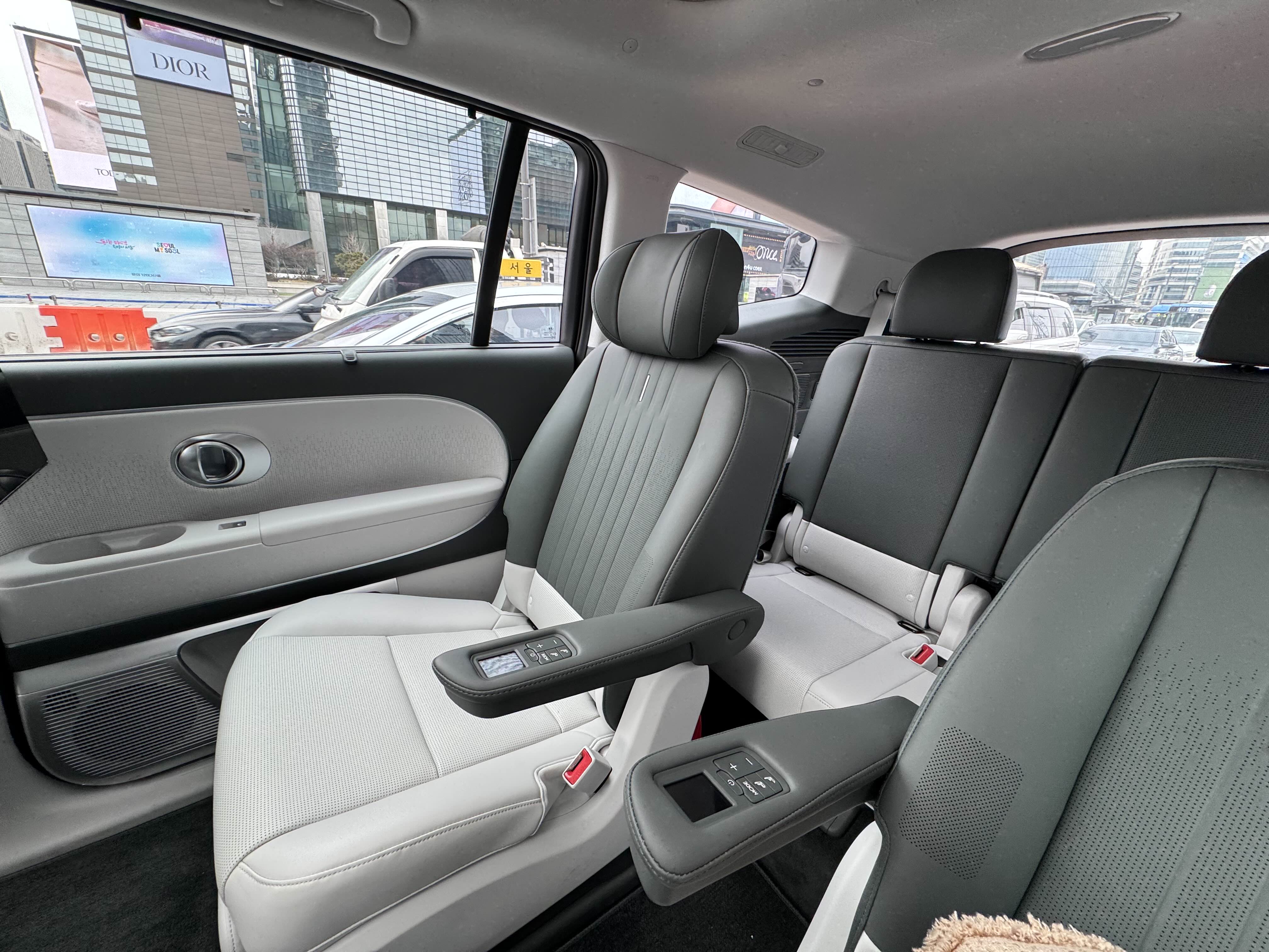 동승자가 있었기 때문에 여러각도에서 사진도 찍을 수 있었고 뒷좌석의 승차감도 평가할 수 있었습니다. 조수석의 공간이 엄청나게 큽니다. 디사미라고 불리우는 디지털 사이드 미러가 보이는데요. 이게 저는 적응하는데 한참 걸렸습니다. 거울로 보기에도 보는 것보다 사물이 가까이에 있다고 하는데 디지털로 보려니 거리가 가늠이 되지 않았습니다. 빨간색 노란색으로 거리가 표시되긴하는데 이것도 자주 타보아야지 적응이 될 것 같았습니다. 저는 디자미 옵션을 빼고 계약했는데 잘했다는 생각이 들었습니다. 디지털 사이드 미러에 적응하면 다시 또 거울형 사이드 미러에 적응하기 쉽지 않을 것 같았기 때문이죠. 사이드미러가 실내에 있기 때문에 다른 차를 타면 실외를 잘 보지 않을 것 같습니다. 이건 제가 회사를 다닐 때 회사차를 아무래도 많이 몰아야하는데 디사미에 적응되면 아무래도 회사차를 몰 때는 불편할 것 같았습니다.