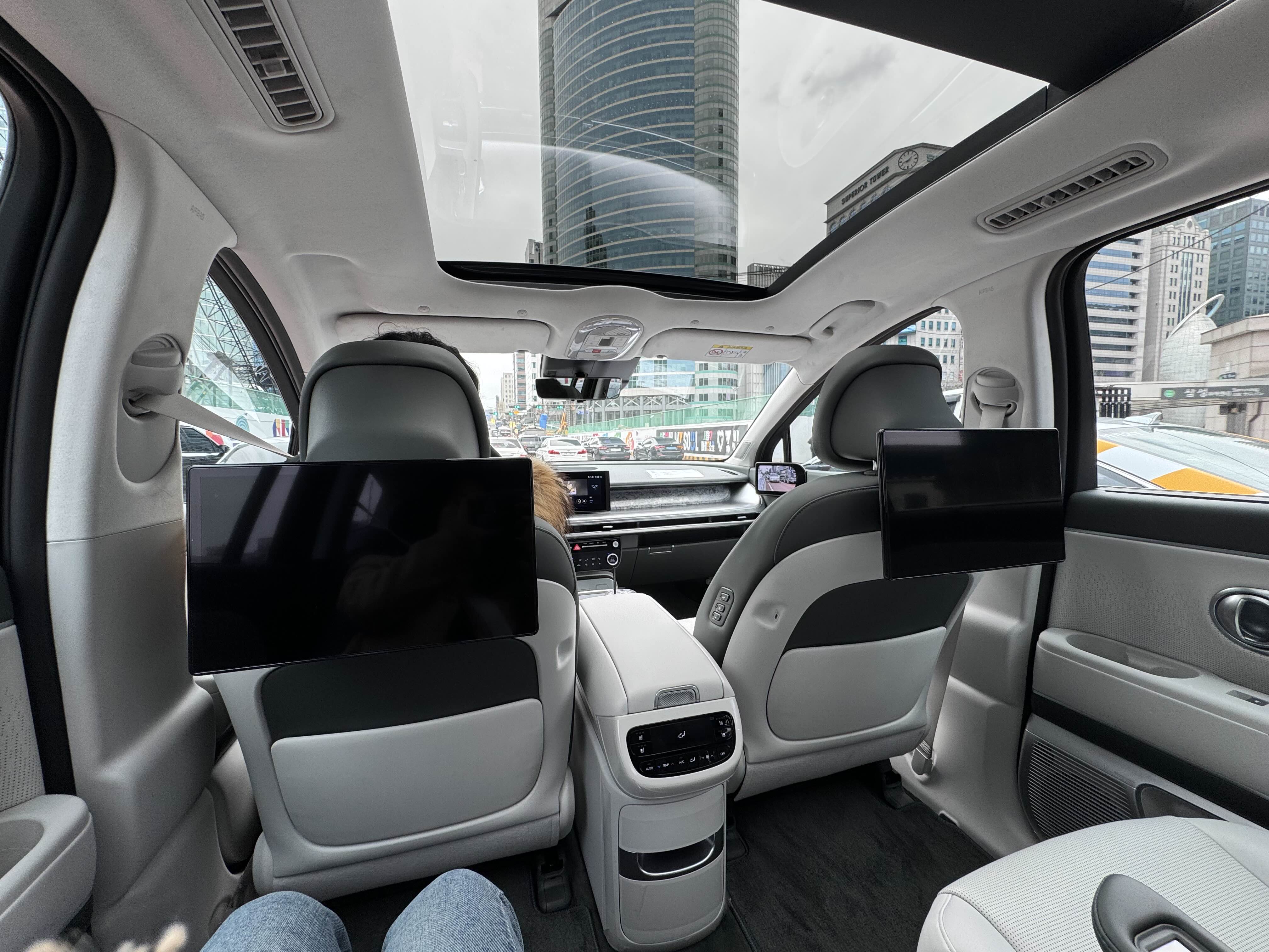 여기에 파노라마 선루프까지 한다면 정말 살아도 될 정도로 넓은 공간감이 나옵니다. 이번에 실내 색상이 올블랙을 제외하고는 밝은 색 투톤을 가지고 있는데 이런 공간감을 극대화하려는 의도적 디자인일 겁니다. 2열에 모니터가 달려있는 풀옵션이었지만 저는 이런 옵션을 뺐습니다. 굳이 자동차를 타면서 미디어를 볼 필요가 없기 때문이죠.