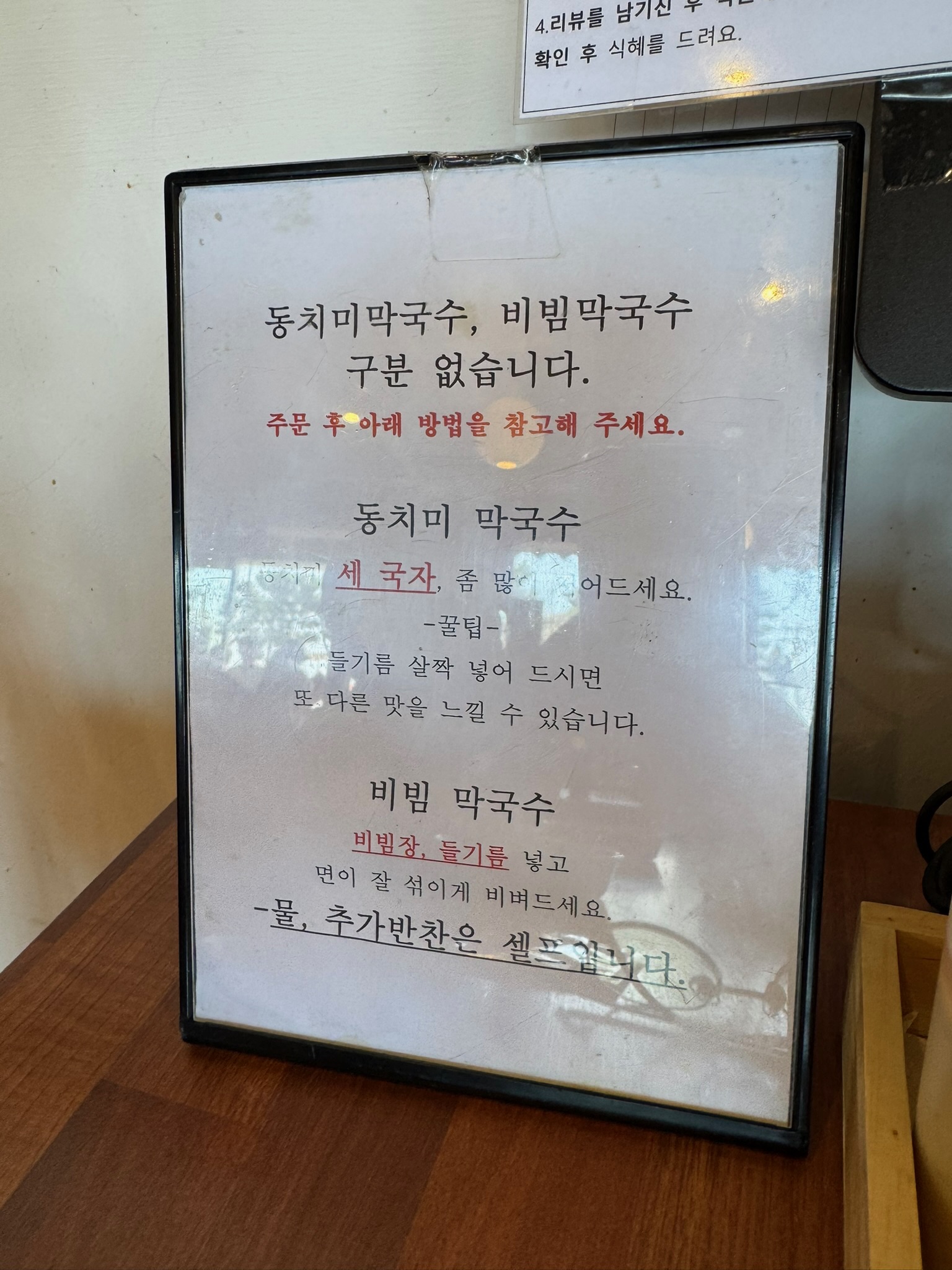 막국수를 먹는 사람은 다 다를 것입니다. 기호에 맞게 넣어 먹으면 되겠죠. 백도막국수에서는 기본 적으로 어떻게 먹어야하는지 설명하고 있습니다. 저는 초반에는 식초와 겨자를 조금 넣고 육수도 조금 넣어 비빔식으로 먹다가 나중에 육수와 양념을 추가하면서 물 막국수로 끝을 냅니다. 평양냉면을 먹을 때도 마찬가지로 처음에는 육수에만 슴슴하게 먹다가 나중에 겨자와 식초를 추가하면서 먹죠.