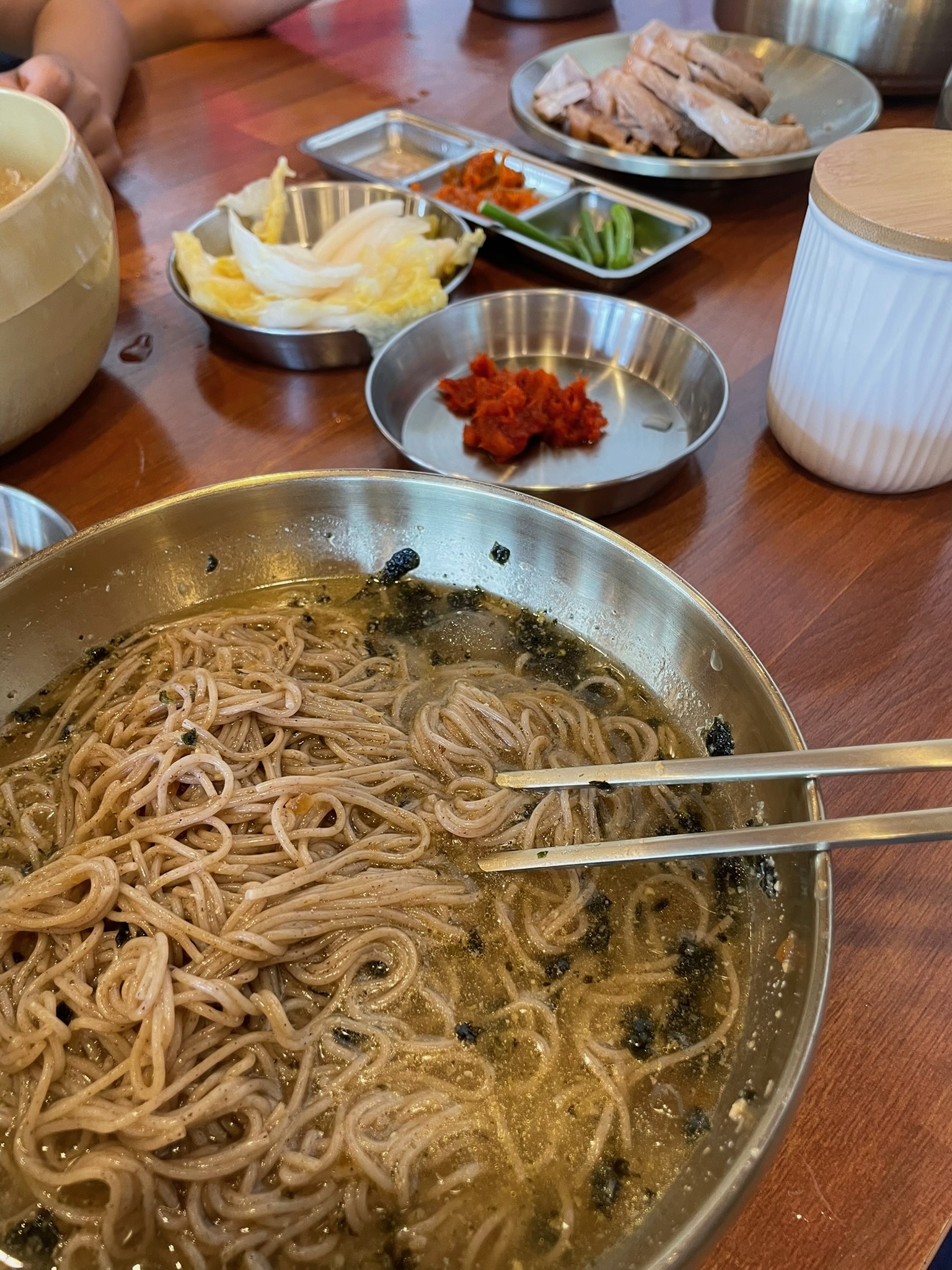 막국수만 먹기에는 아쉬워서 수육도 시켰습니다. 아래는 기본 찬입니다. 명태회무침과 마늘쫑, 새우젓, 백김치가 나옵니다. 먼저 육수가 나왔기에 육수부터 한잔 들이킵니다. 역시 실망하지 않을 깊고 진한 동치미 맛이 납니다.