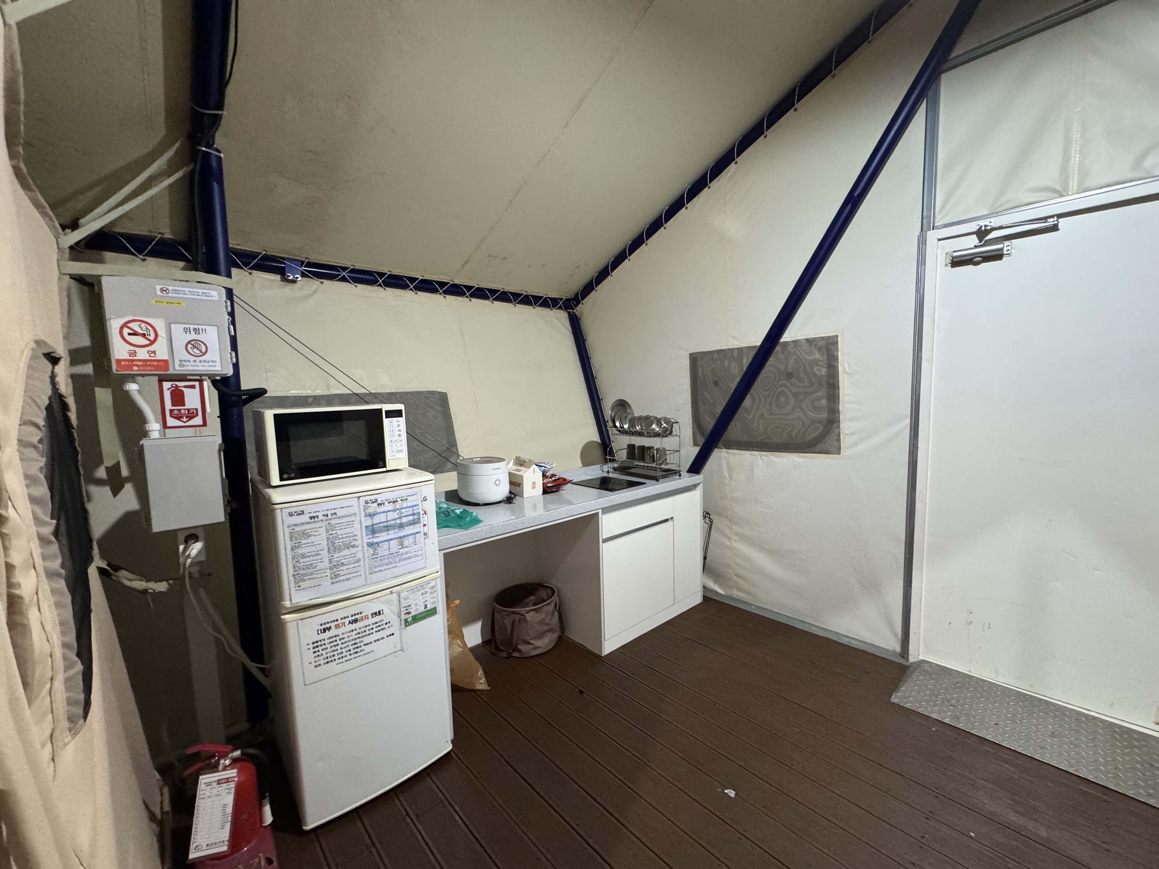 객실 내부 주방은 냉장고·전자레인지·하이라이트(또는 인덕션)·커피포트·간단한 식기류 정도만 있다. 전기밥솥은 동별로 차이가 있으니 우리는 개인 밥솥을 가져갔고, 그게 편했다. 중요한 건 싱크대와 물 나오는 건 전부 공용 취사장·개수대에서 처리해야 한다는 점인데, 실제로 설거지와 물 사용은 공용 공간으로 나가야 해서 겨울엔 동선이 꽤 춥다.