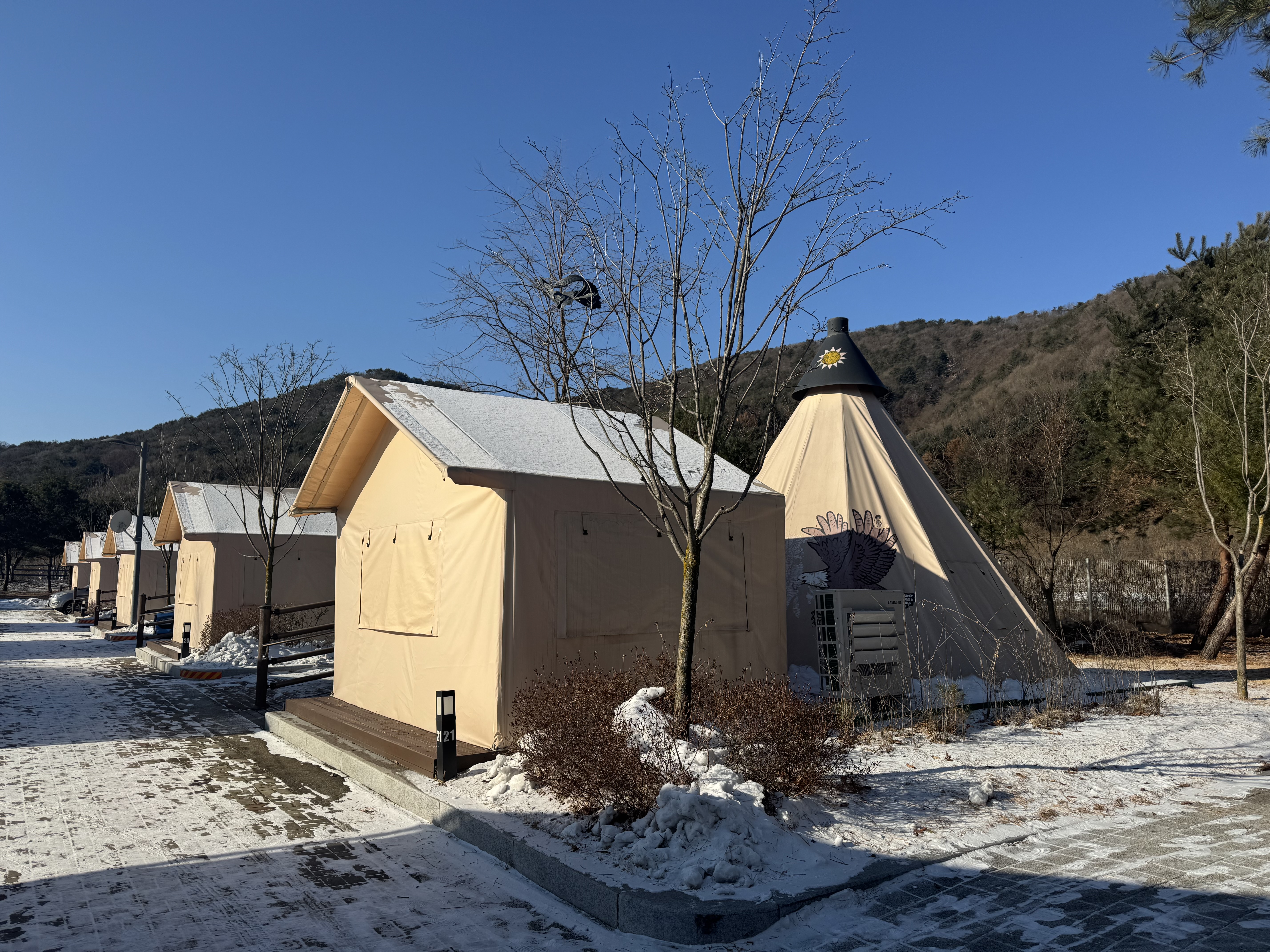 겨울이라 설렘 반 걱정 반으로 갔는데, 도착하니 텐트들이 눈에 둘러싸여 생각보다 평화로운 풍경이더라. 차에서 내리면 바로 옆에 주차할 수 있어서 짐 옮기기 수월했고, 텐트 외관은 사진에서 본 느낌 그대로 깔끔했다.