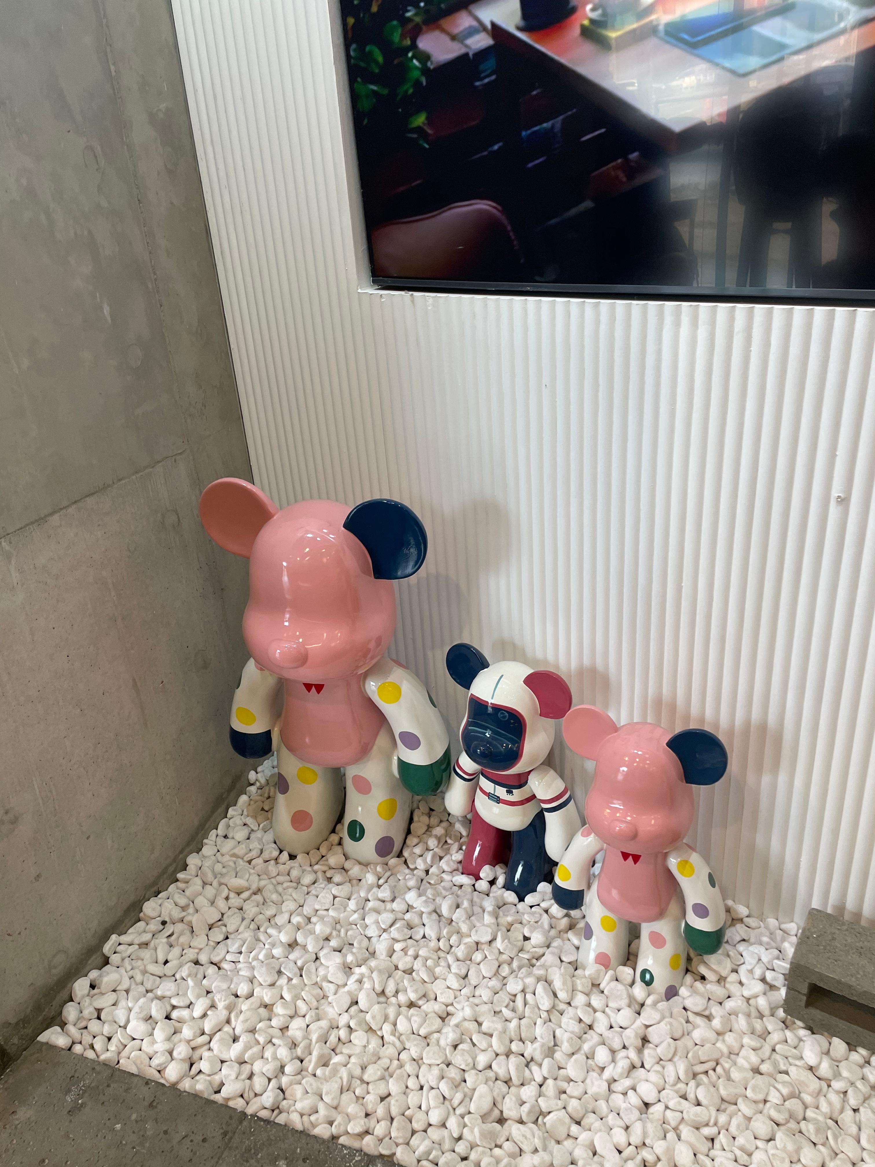 실내는 노출 콘크리트 구조물이 주는 모던함과 곳곳에 놓인 패브릭, 쿠션, 작고 개성 있는 소품들이 주는 따뜻함이 공존한다. 세 개의 곰 인형이 놓인 작은 코너는 아이들이 금세 달려들만한 포인트였고, 쇼룸처럼 옷과 패브릭 제품이 배치된 공간을 거닐다 보면 카페를 쇼핑 공간으로 소비하는 감각이 자연스럽게 따라온다. 3층까지 이어지는 구조라 층별로 분위기가 조금씩 달라지는 점도 흥미로웠다.